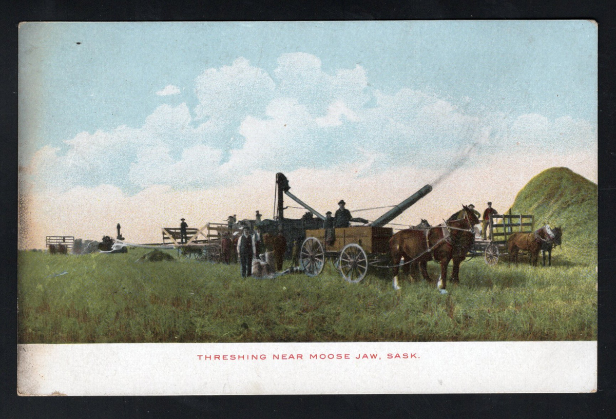 346 PC   image1907 Carlyle ASSA Postmark on Picture Postcard, a fine strike dated JUN.21.1907 on a Moose Jaw threshing picture postcard mailed to Winnipeg (JUN.23 carrier handstamp), very fine. Emerging Saskatchewan reports very few examples, RF D. (Scan 1) (Scan 2) (All Scans) (All Images)