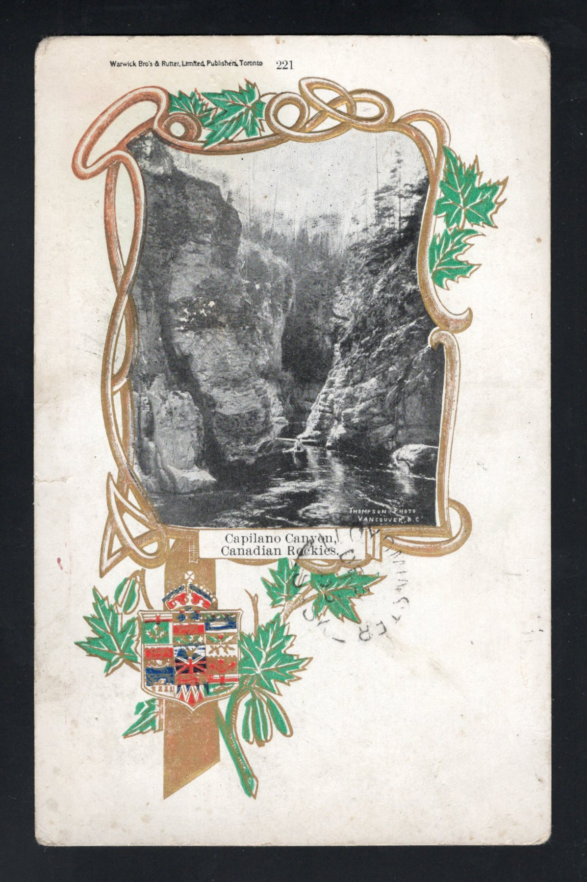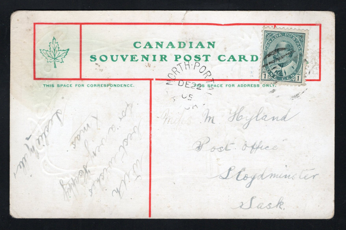 347 PC   image1905 North Portal ASSA Postmark on Picture Postcard, a fine strike dated DEC.22.1905 on a patriotic picture postcard mailed to Lloydminster Sask. (DEC.30 receiver on picture side), small faults, still fine. Emerging Saskatchewan reports 25 examples of this broken circle, RF D. Additionally, Lloydminster is recorded open from 1903 to 1905 only according to Territorial Post Offices of Canada and has a RF E. (Scan 1) (Scan 2) (All Scans) (All Images)