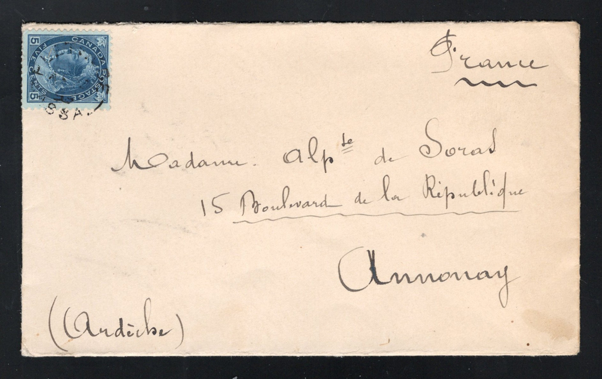 348 CVR   image1899 Fletwode ASSA Postmark on Cover to France, a fine strike dated AUG.??.1899 on a 5c blue Queen Victoria Numeral cover to Annonay, France (SEP.12.1899 receiver on back), very fine. Emerging Saskatchewan reports only 14 examples of this broken circle (only 4 of those on cover), RF E. (Scan 1) (Scan 2) (All Scans) (All Images)