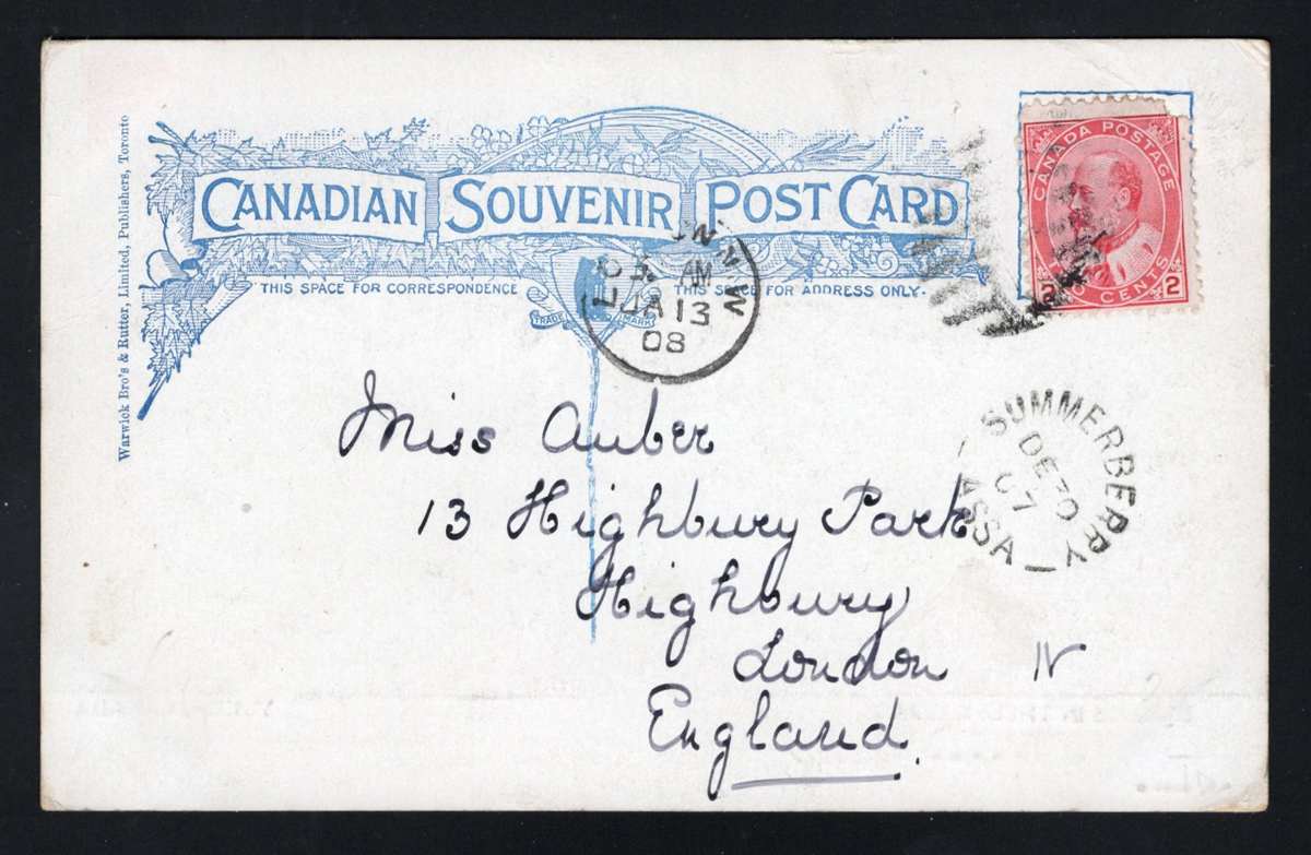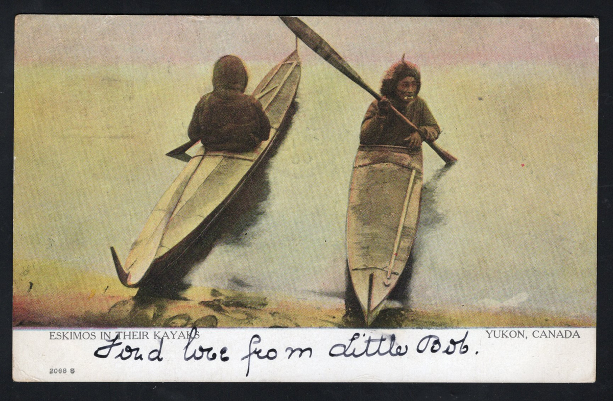 349 PC   image1907 Summerberry ASSA Postmark on Picture Postcard, a very fine strike dated DEC.30.1907 on a lovely "Eskimos in their Kayaks / Yukon Canada" picture postcard mailed to England (JAN.13.1908 receiver), very fine. Emerging Saskatchewan reports only 5 examples of this first broken circle, previously RF D, now "RR". (Scan 1) (Scan 2) (All Scans) (All Images)