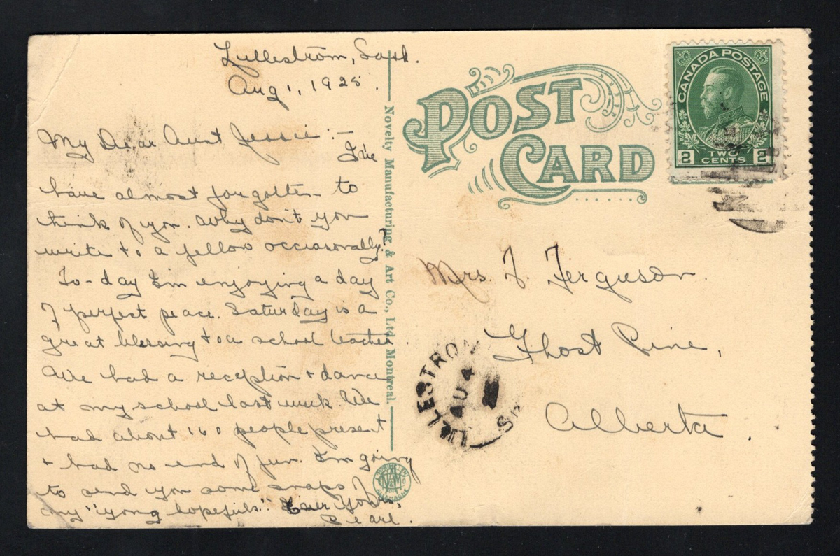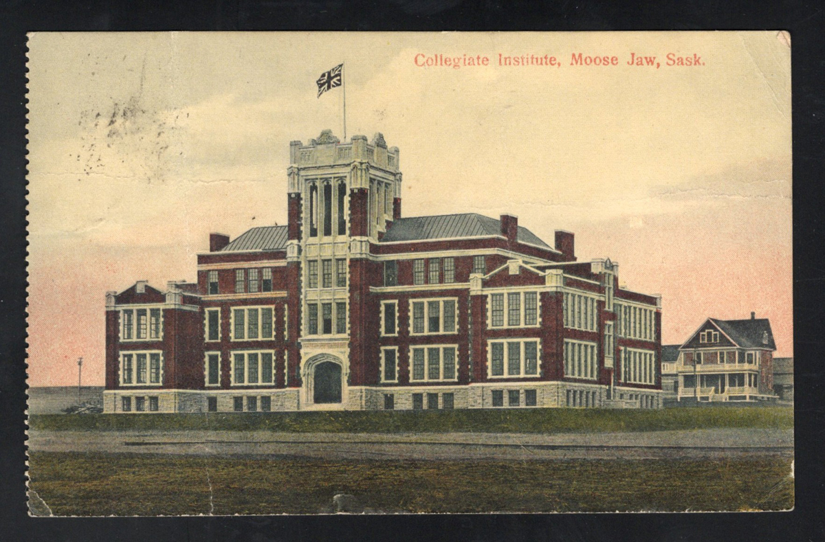 350 PC   image1925 Lillestrom Sask Postmark on Postcard, a "Collegiate Institute, Moose Jaw, Sask." postcard mailed on AUG.4.1925 (fine free strike) to Ghost Pine, Alberta, light crease does not detract, very fine. A scarce postmark. (Scan 1) (Scan 2) (All Scans) (All Images)