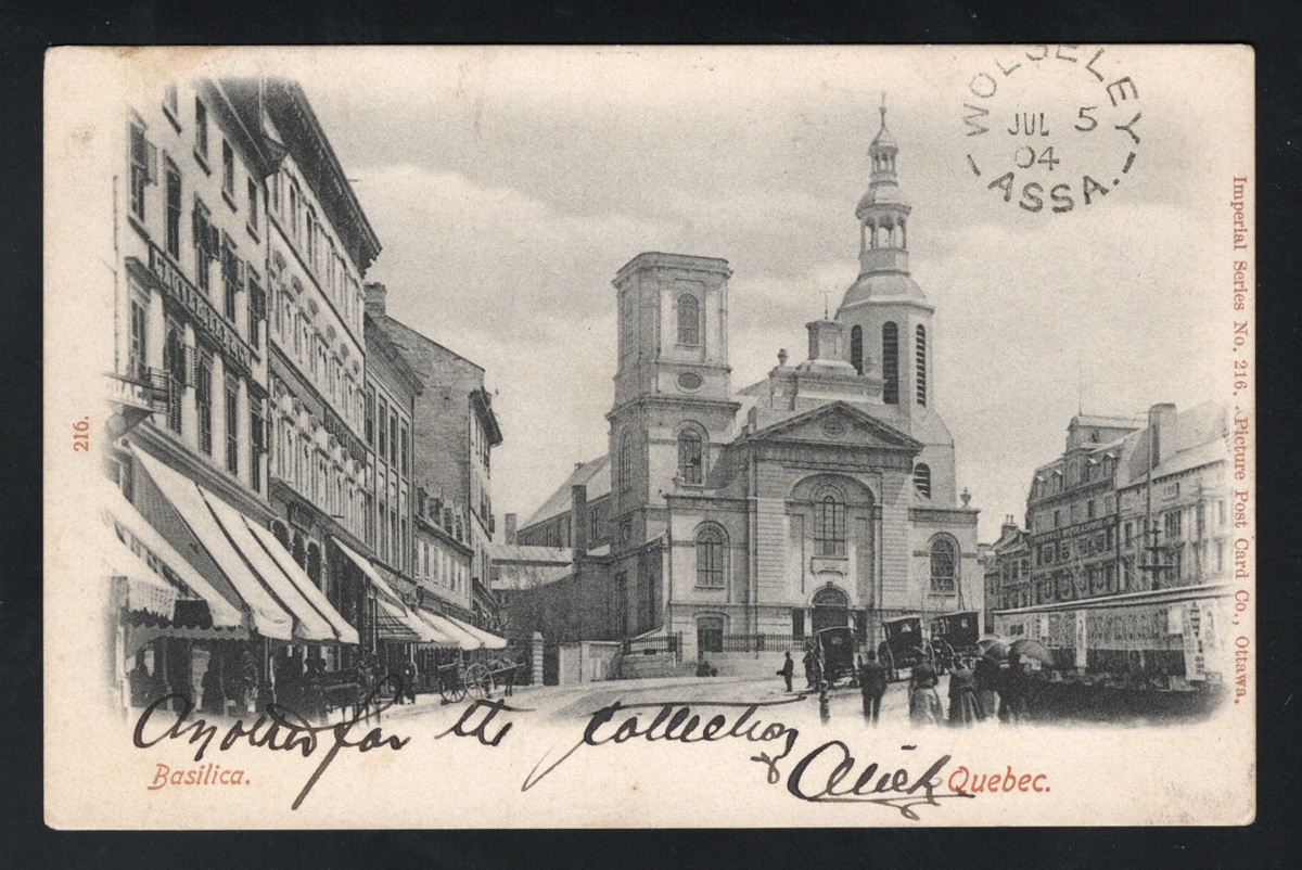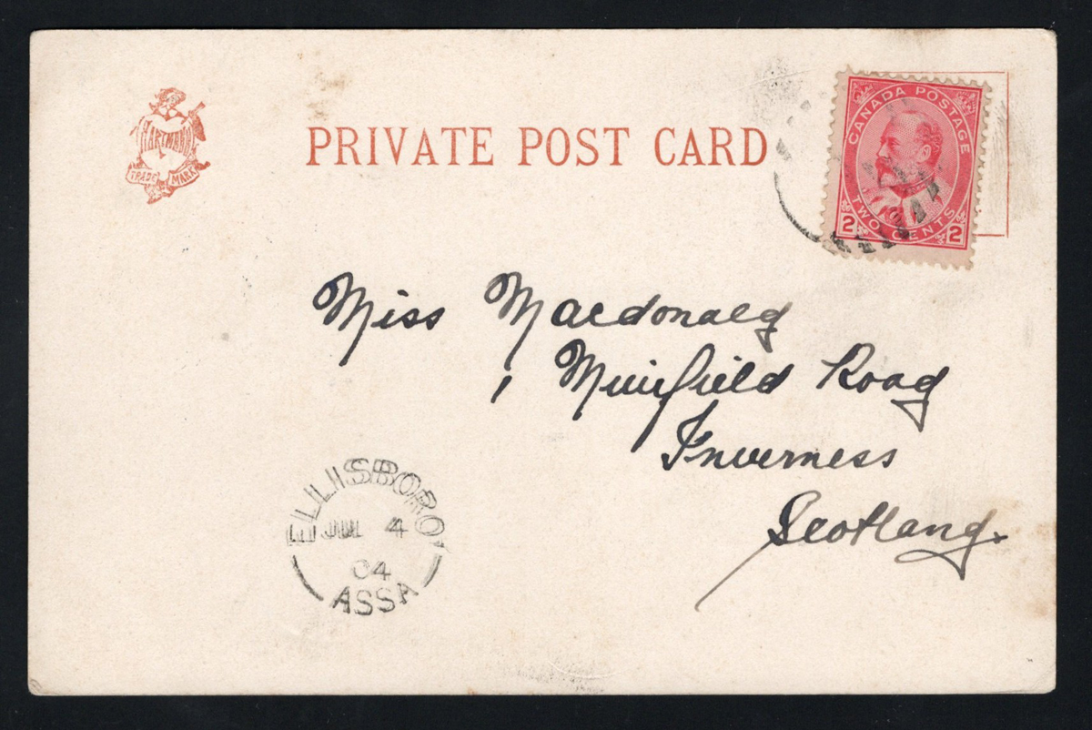 351 PC   image1904 Ellisboro and Wolesley ASSA Postmarks on Private Picture Postcard, a very fine free strike of Ellisboro dated JUL.4.1904 on a an early "Basilica Québec" picture postcard mailed to Scotland, through Wolseley ASSA (JUL.5 transit on picture side), very fine. the card was printed by "Imperial Series No. 216 - Picture Post Card Co., Ottawa". There is also a small "Hartmann / Trade Mark" logo printed on message side. Emerging Saskatchewan reports only 13 examples of this first broken circle, RF D. (Scan 1) (Scan 2) (All Scans) (All Images)