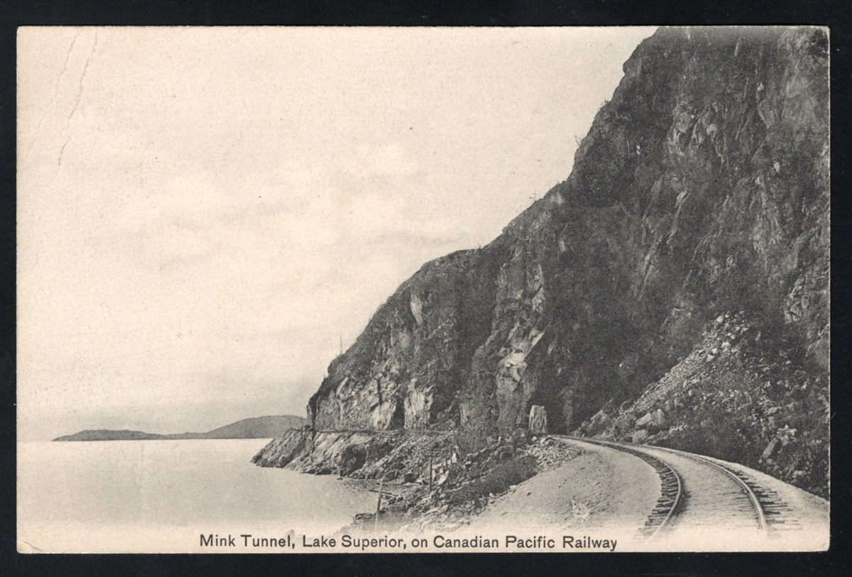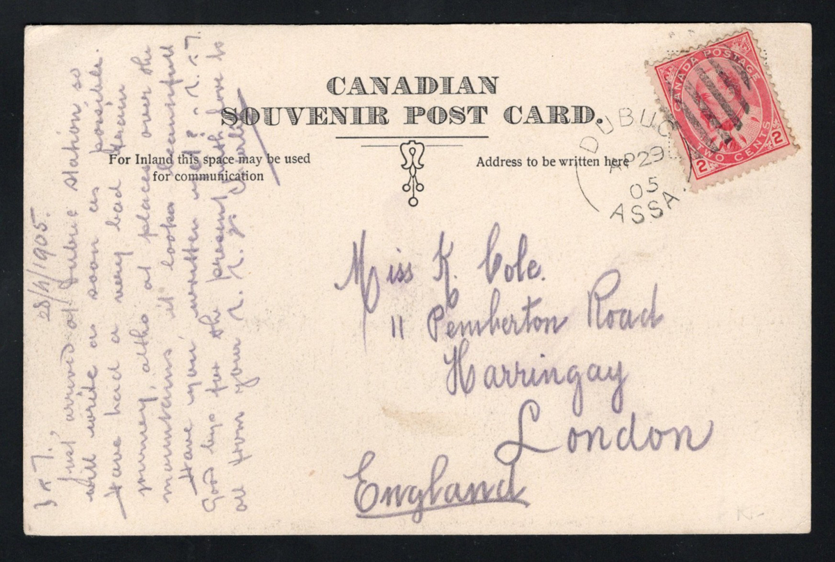 352 PC   image1905 Dubuc ASSA Postmarks on a Picture Postcard, a very fine (proof-like) free strike of Dubuc dated APR.29.1905 on a an early "Mink Tunnel, Lake Superior, on Canadian Pacific Railway" picture postcard mailed to England, very fine. Emerging Saskatchewan reports only 8 examples of this broken circle (between 1905 and 1908), RF E. (Scan 1) (Scan 2) (All Scans) (All Images)
