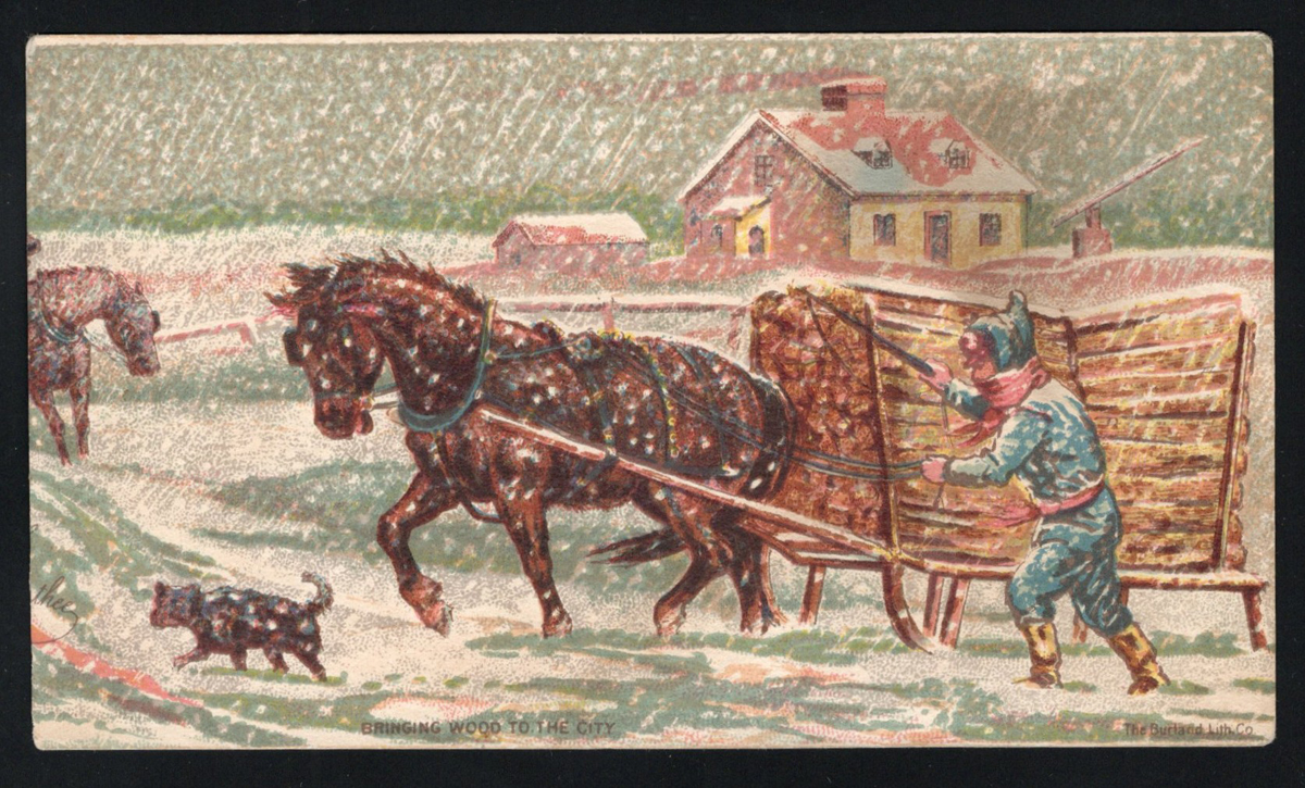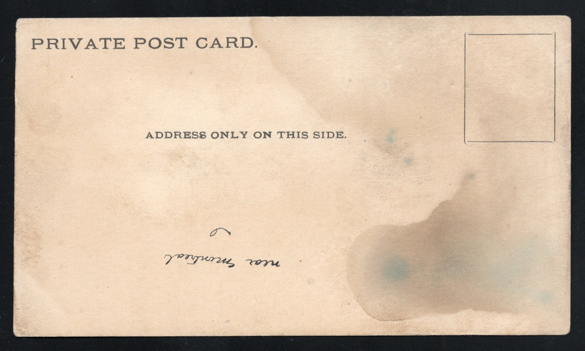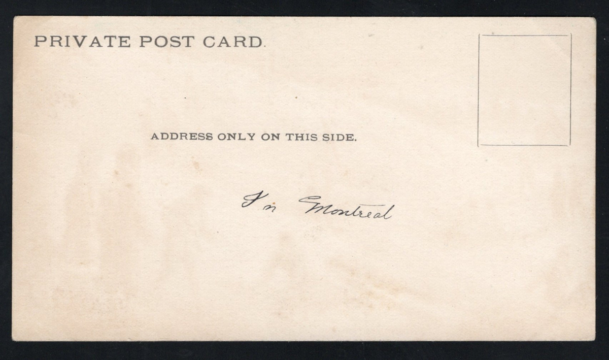 357 PC   imageVery Early Undivided Canadian Picture Postcard, with picture side depicting a multi-colour winter scene of a horse pulling a load of logs in the snow. The message side reads "Private Post Card" and "Address only on this side" and has a simple rectangle for the stamp. There is a manuscript notation reading "near Montreal". Light stains, still a rare early card. (Scan 1) (Scan 2) (All Scans) (All Images)