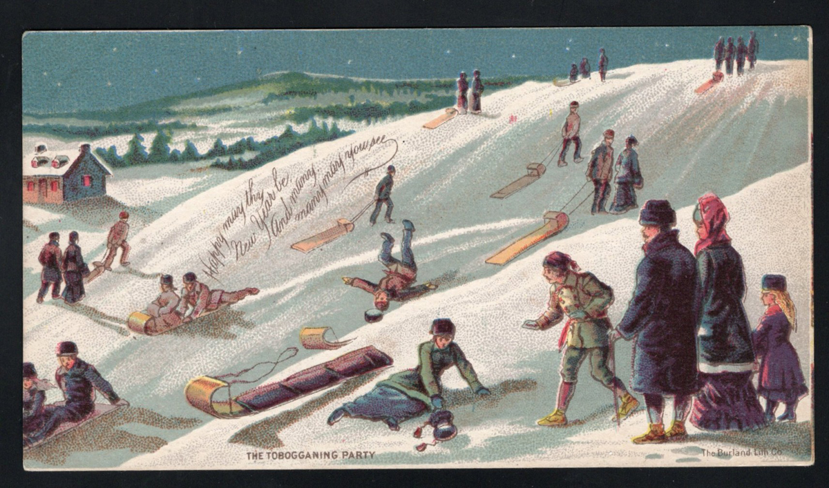 358 PC   imageVery Early Undivided Canadian Picture Postcard, with picture side depicting a multi-colour winter scene of children and adults tobogganing in the snow. Caption reads "The Tobogganing Party" and there is a message printed reading "Happy may thy New Year be and Many Many May you see". The message side reads "Private Post Card" and "Address only on this side" and has a simple rectangle for the stamp. There is a manuscript notation reading "in Montreal". A very fine and rare early card. (Scan 1) (Scan 2) (All Scans) (All Images)