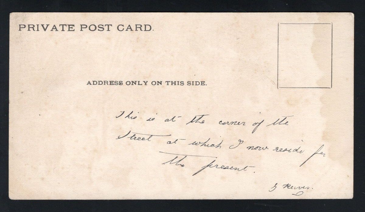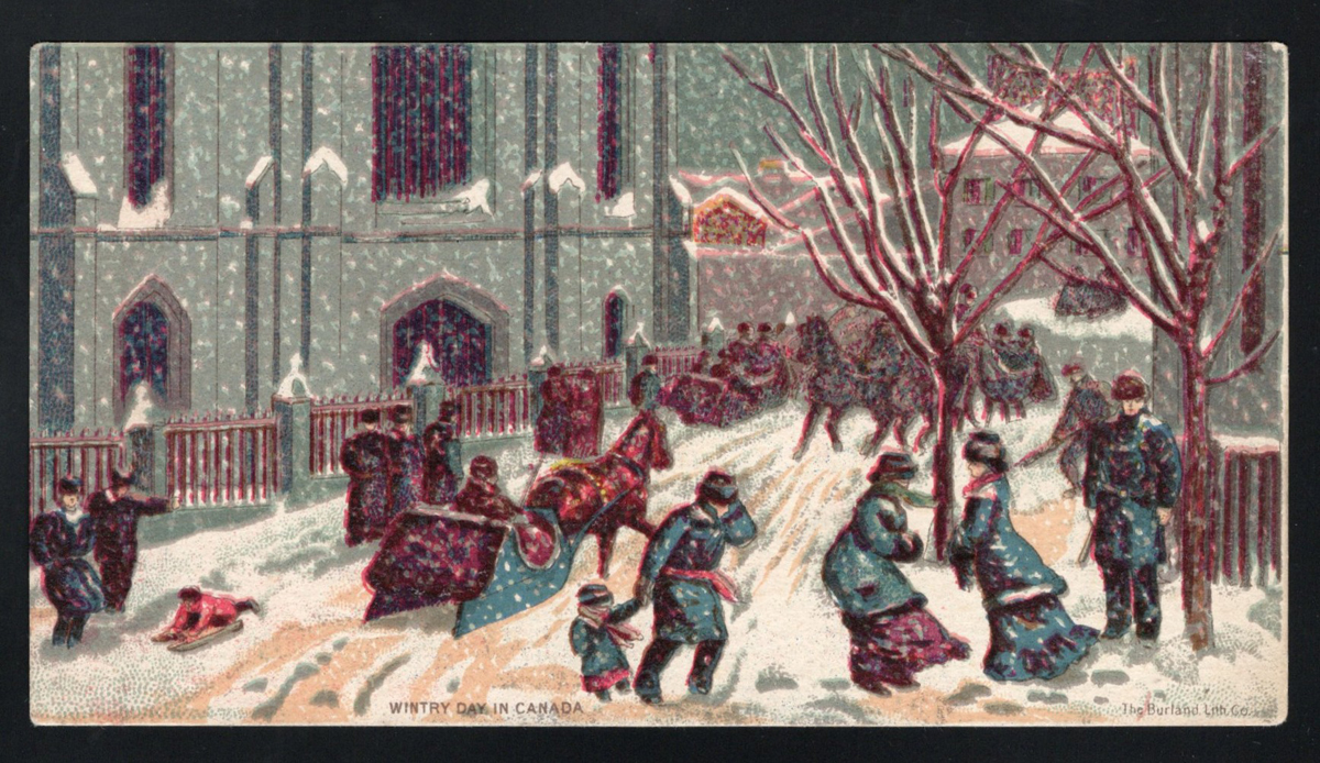 359 PC   imageVery Early Undivided Canadian Picture Postcard, with picture side depicting a multi-colour winter scene of children and adults walking in the snow on a stormy day. Caption reads "Wintry Day in Canada". The message side reads "Private Post Card" and "Address only on this side" and has a simple rectangle for the stamp. There is a manuscript notation reading "This is at the corner of the street at which I now reside for the present". A very fine and rare early card. (Scan 1) (Scan 2) (All Scans) (All Images)
