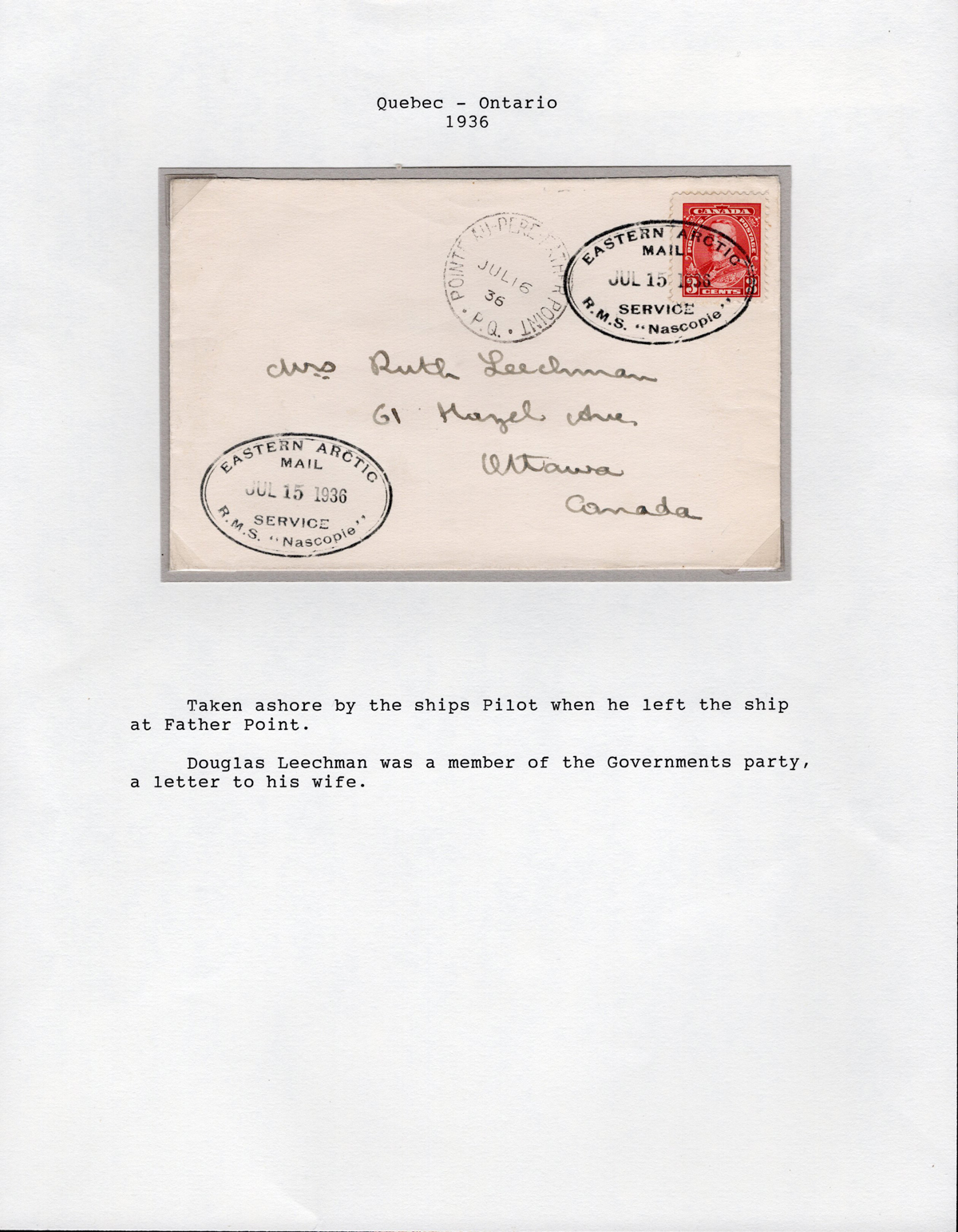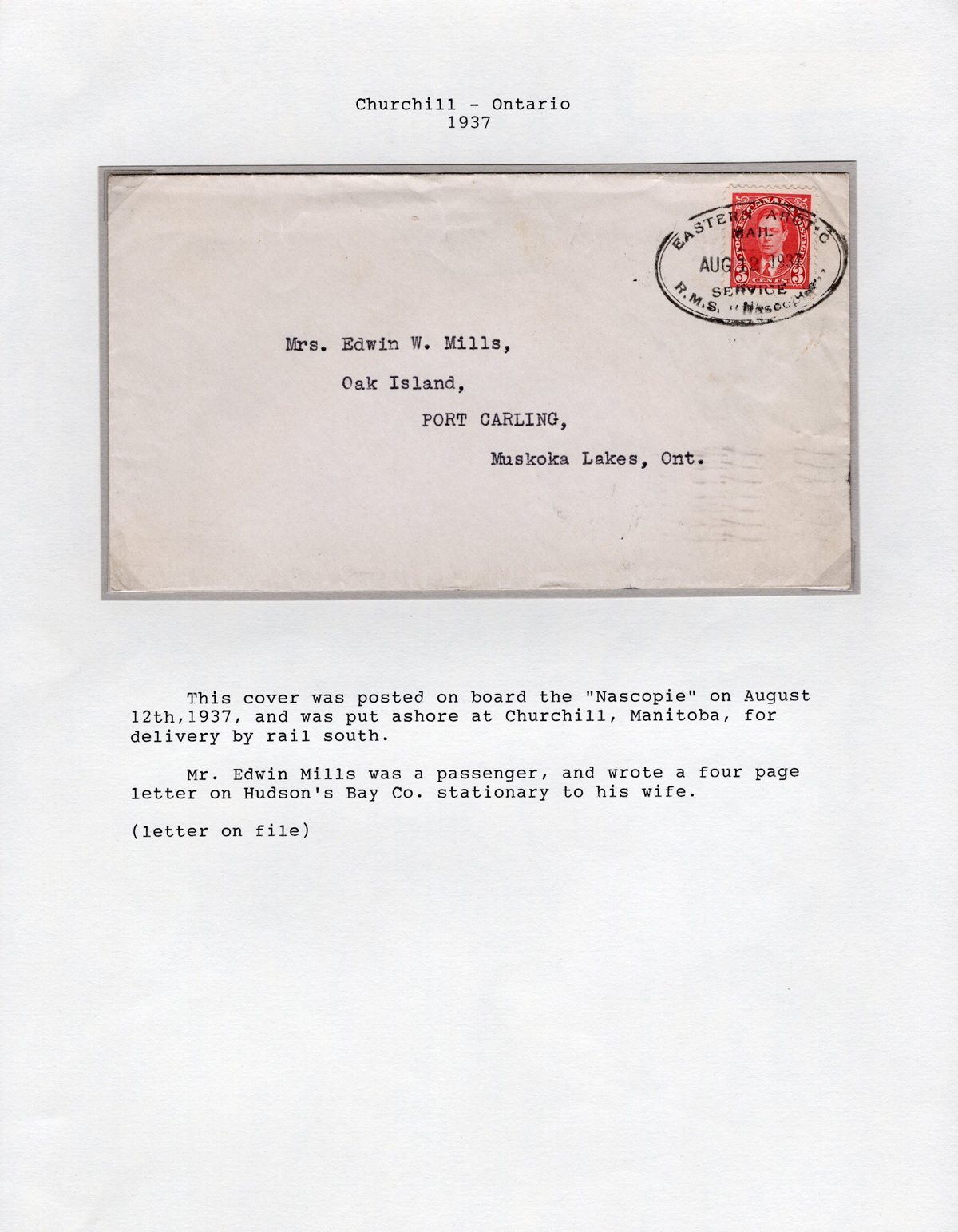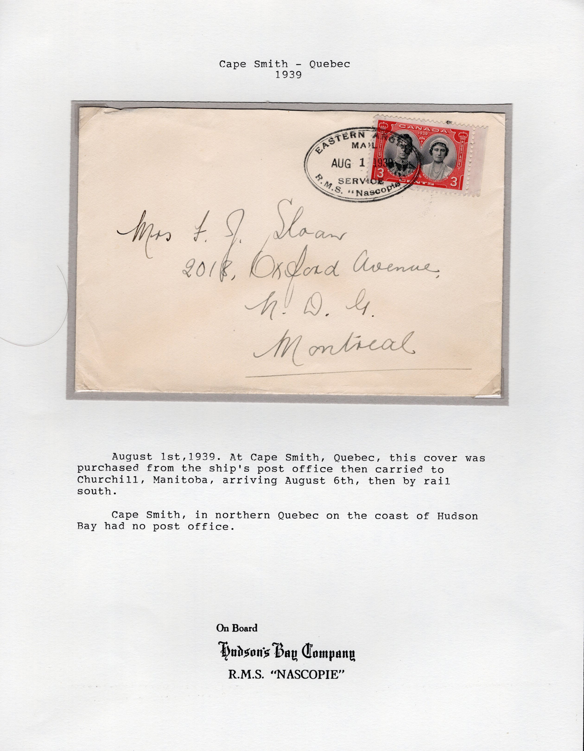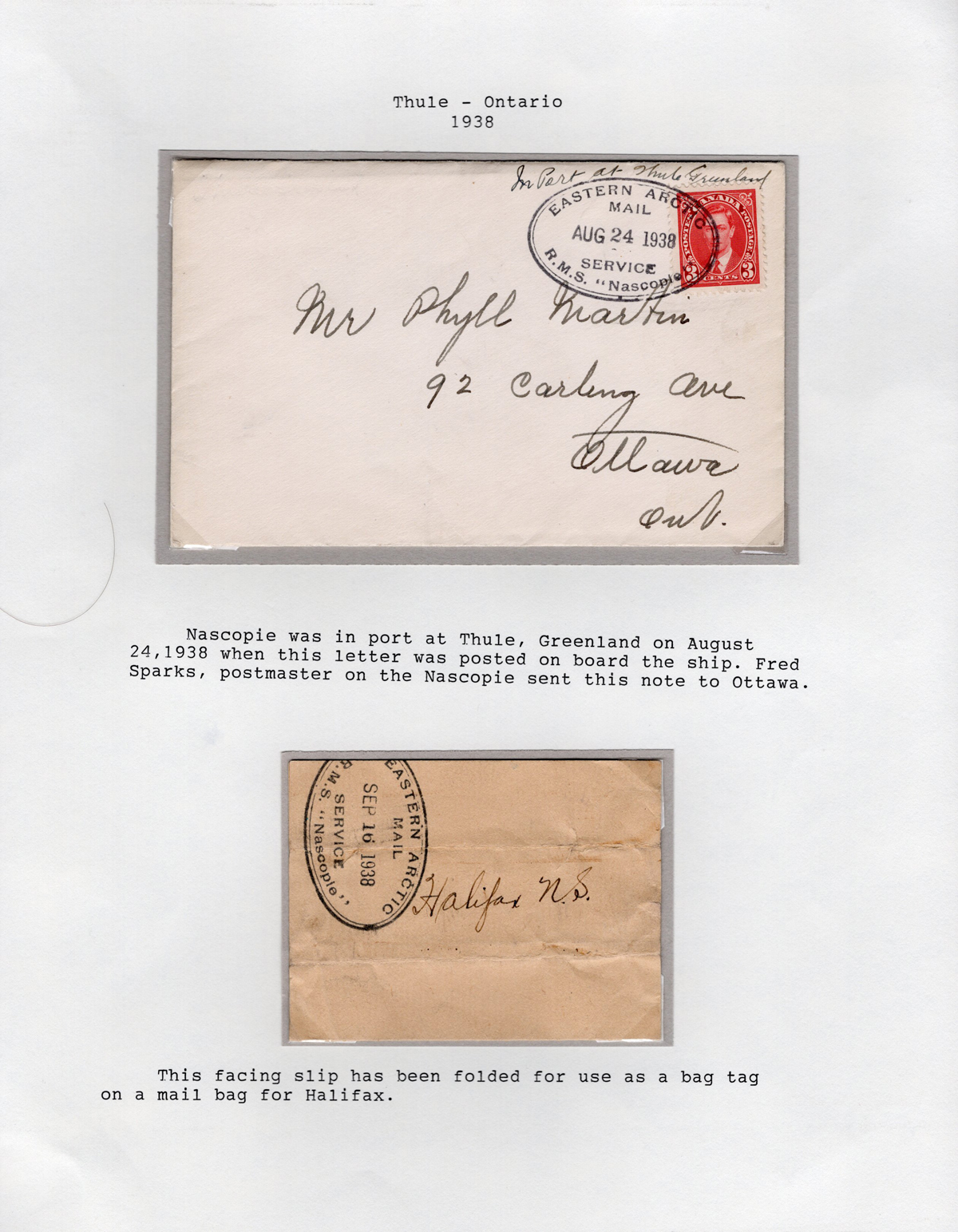 341 CVR   image1936-1939 Group of 4 Covers with Oval R.M.S. Nascopie Datestamps, with one for every year in the period, all written-up on 4 exhibit pages, also includes an interesting folded facing slip that was used in 1938 as a bag tag. A very fine group, all scanned online. (Scan 1) (Scan 2) (Scan 3) (Scan 4) (All Scans) (All Images)