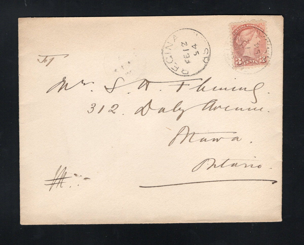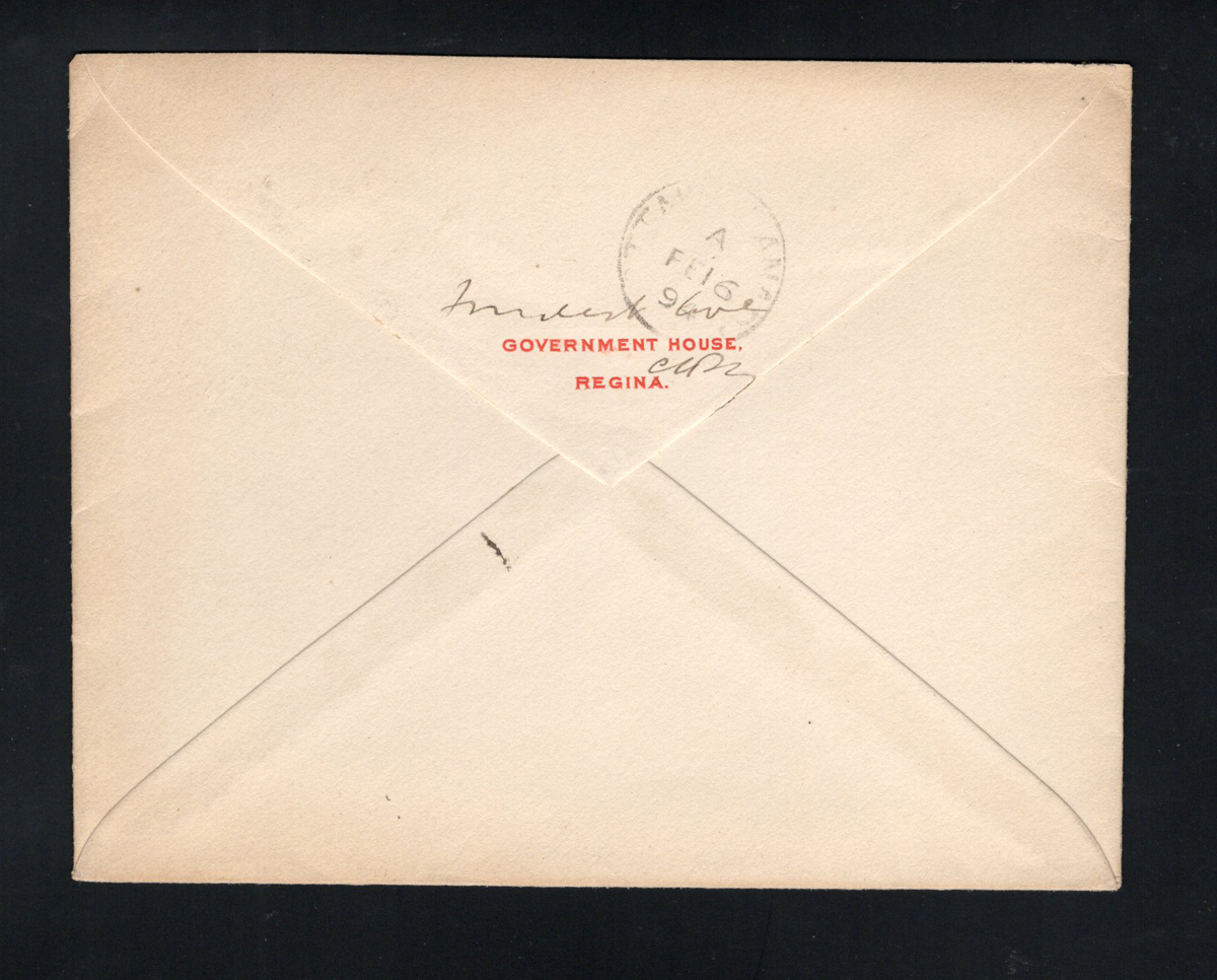 353 CVR   image1894 Regina ASSA Small Queen Cover to Sir Sanford Fleming, a cover with “Government House, Regina” back flap mailed on FEB.12.1894 (c.d.s. free strike, second strike tying stamp) to Sir Sanford Fleming (the designer of Canada’s first stamp) in Ottawa (FEB.16 receiver). Franked with a 3c Small Queen, very fine. (Scan 1) (Scan 2) (All Scans) (All Images)