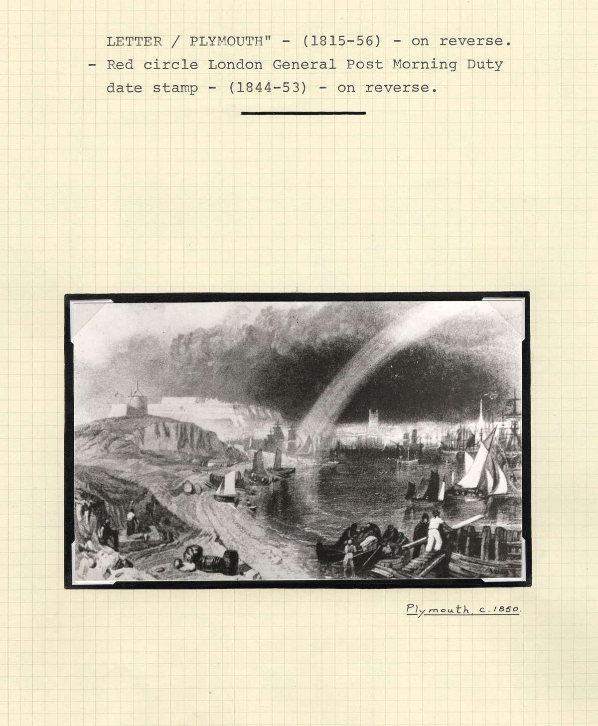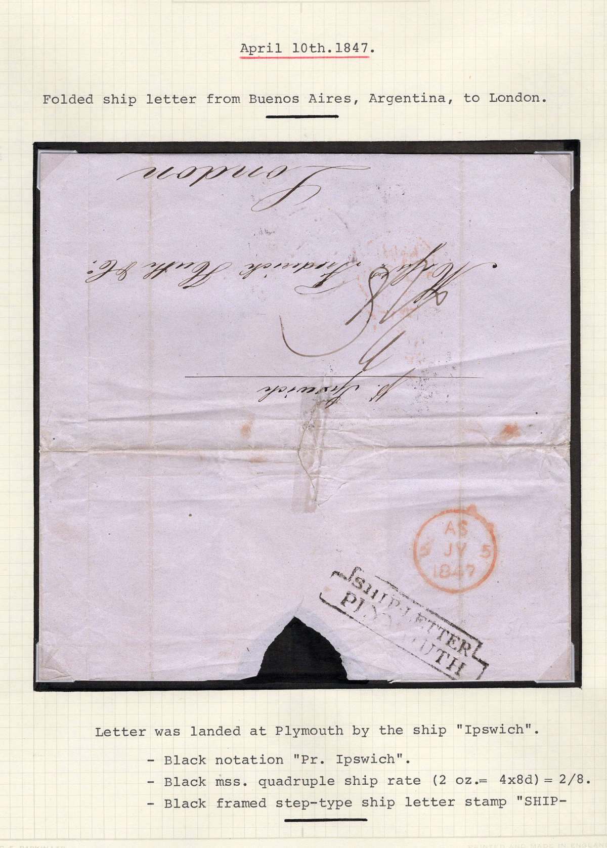 360 CVR   image1847 Folded Cover from Argentina to England, mailed on APR.10.1847 (docketing) to London (JUL.5.1847 receiver in red) with boxed “SHIP-LETTER / PLYMOUTH” handstamp and endorsed “per Ipswich”, fine. Written-up on two pages, one of which shows a picture of Plymouth circa 1850. (Scan 1) (Scan 2) (All Scans) (All Images)