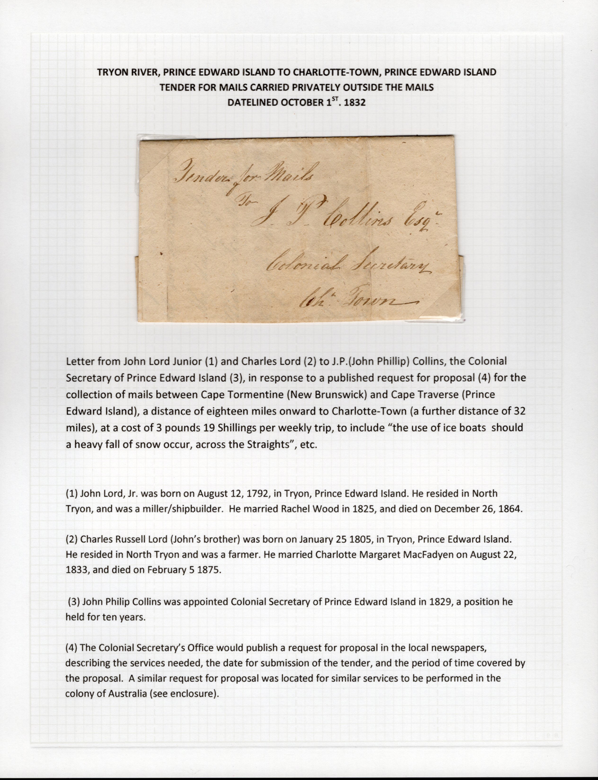 342 CVR   image1832 Prince Edward Island Tender for Mails Folded Letter, datelined “Tyron River October 1st 1832” and addressed to the Colonial Secretary in Charlottetown detailing a proposal for the collection of mails between Cape Tormenting and Cape Traverse, and on to Charlottetown, to include “the use of ice boats should a heavy fall of snow occur, across the straights,” etc. A remarkable and rare document in very fine condition, accompanied by a transcript of the two page letter inside.