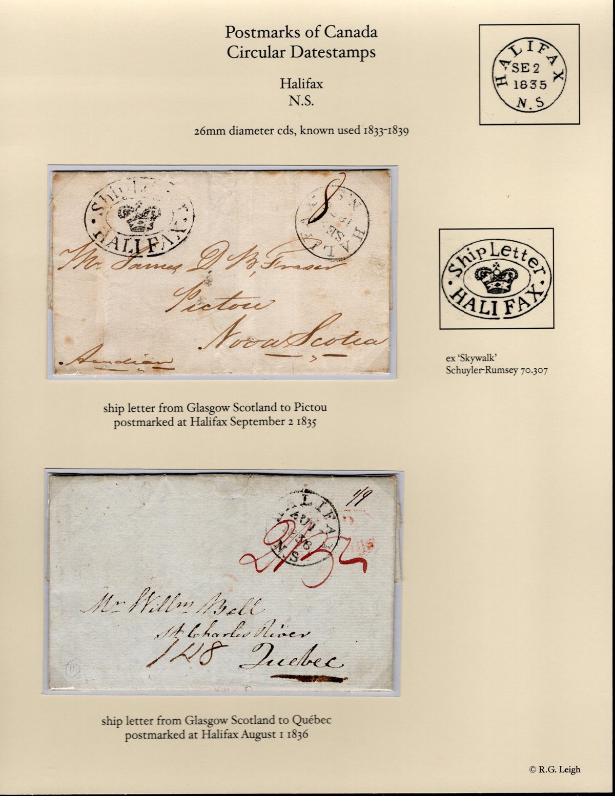 Letters Mailed via Halifax (N.S.), first was mailed from Glasgow, Scotland to Pictou N.S., endorsed "Acadian" and entered the mails in Halifax (SEP.2.1835 small c.d.s. plus a large oval crown "SHIP LETTER / HALIFAX" postmarks), fine, with no