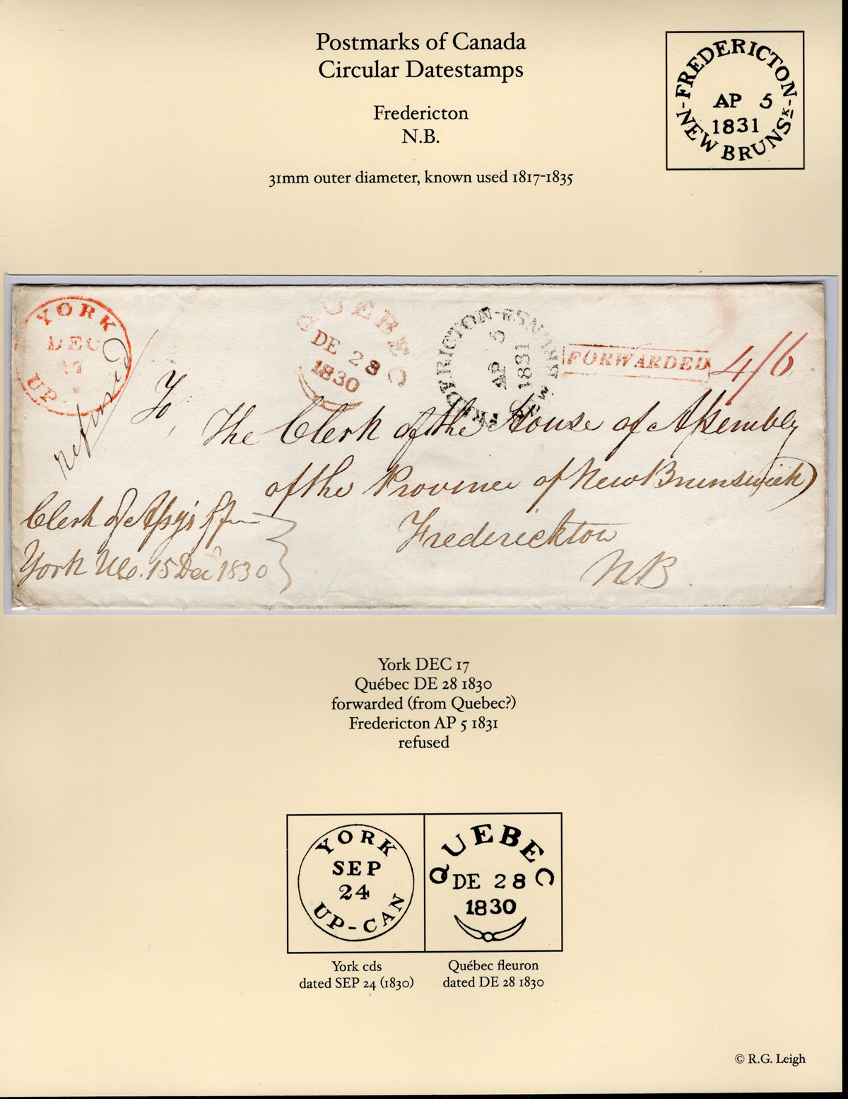 Folded Cover to Fredericton N.B. mailed on DEC.17.1830 (large circle in red) to Fredericton N.B. (APR.5.1831 large broken circle receiver on front) through Québec City (DEC.28.1830 Fleuron-type transit) where a "FORWARDED" handstamp was applied.
