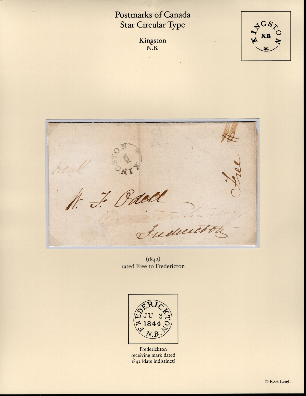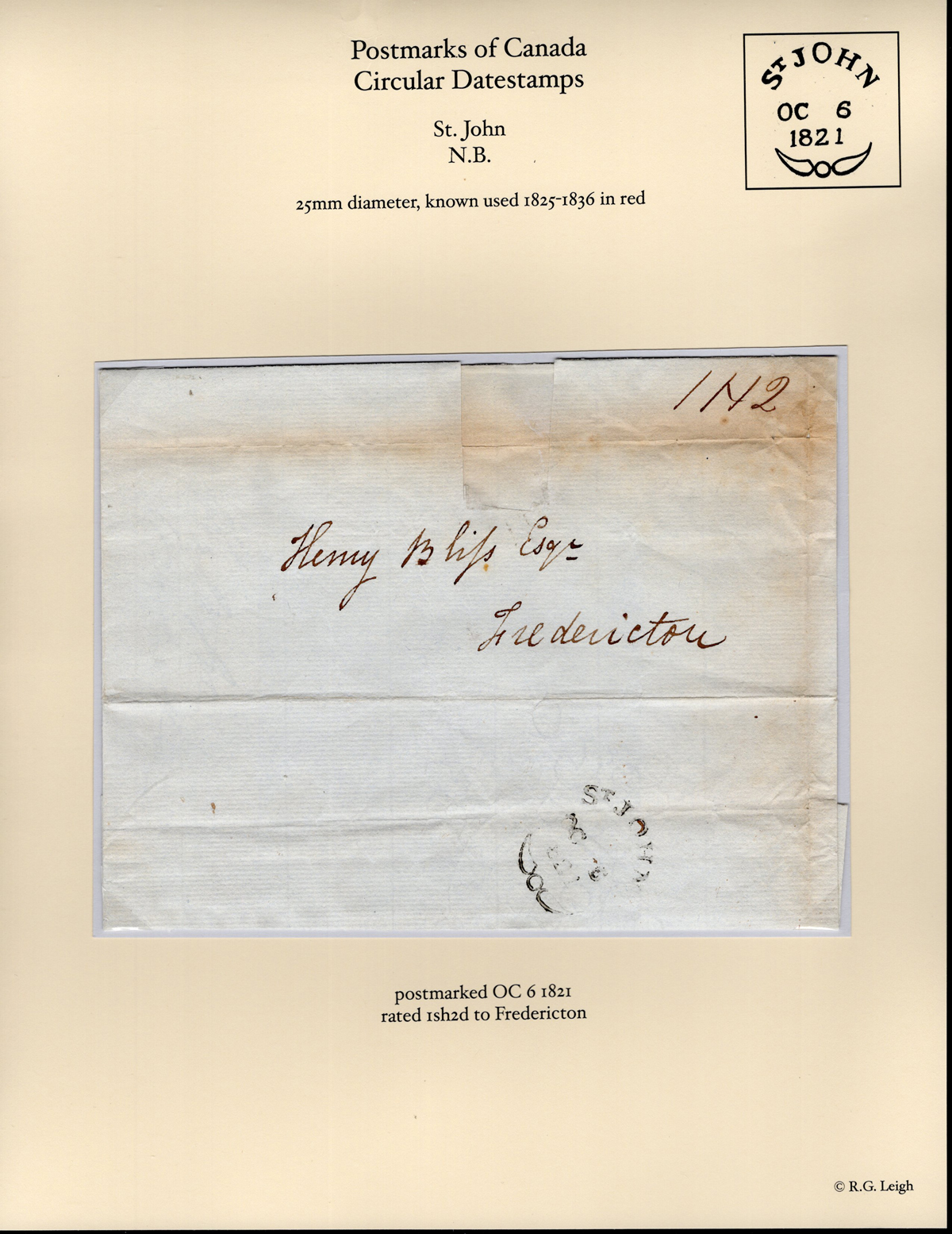 Fleuron on Folded Cover to Fredericton, mailed on OCT.6.1821 (fine strike of scarce Fleuron type) and rated 1sh2d, fine.