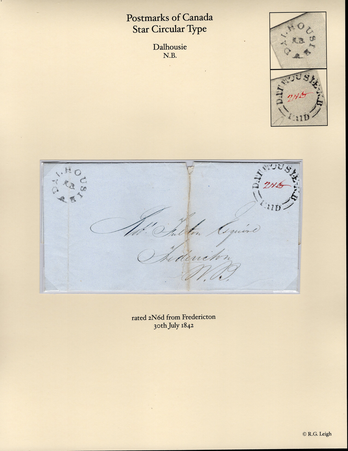 Star Cancel on Folded Cover to Fredericton N.B., mailed on JUL.30.1842 (docketing on back), with a Dalhousie star cancel and a Dalhousie N.B. / PAID postmark with "2N6" rate inside. Repaired vertical split, else very fine strikes.