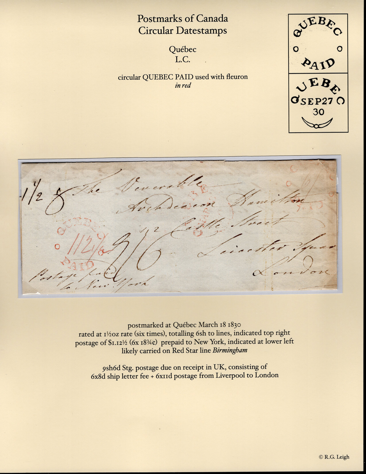 Folded Letter to England, mailed on MAR.18.1830 (Fleuron-type datestamp in red) with a "Quebec / PAID" handstamp in red with manuscript rate "1/2" inside, with "Postage paid to New York" manuscript notation and rectangular boxed "Ship Letter /
