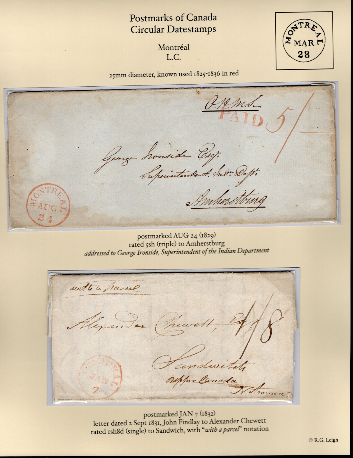 with Small Montréal C.D.S. Postmarks, first mailed AUG.24 (year unknown) to Amherstburg (no letter inside) and second mailed JAN.7.1832 (year is based on dateline inside) to Sandwitch (sic) U.C. with a manuscript notation "with a parcel" on