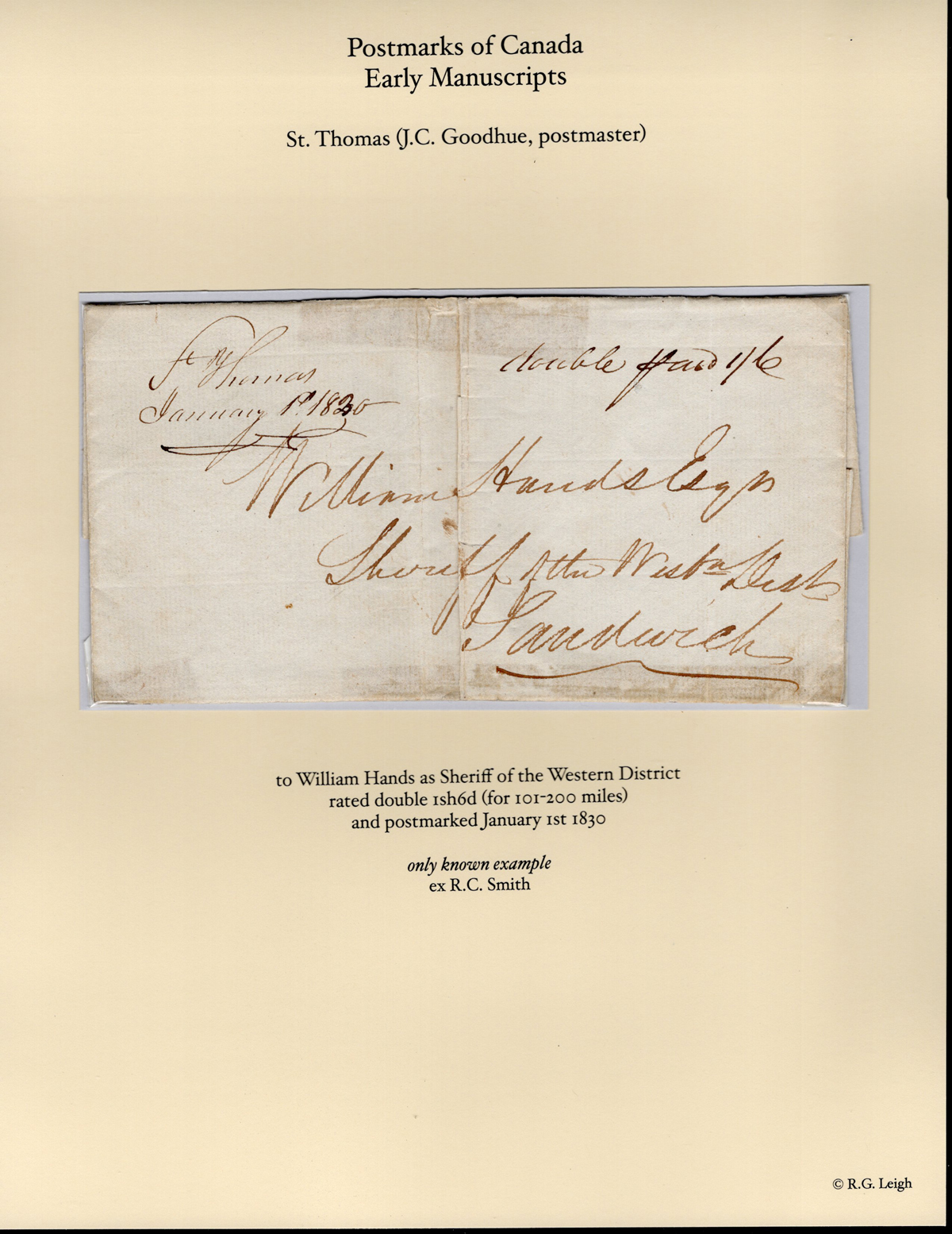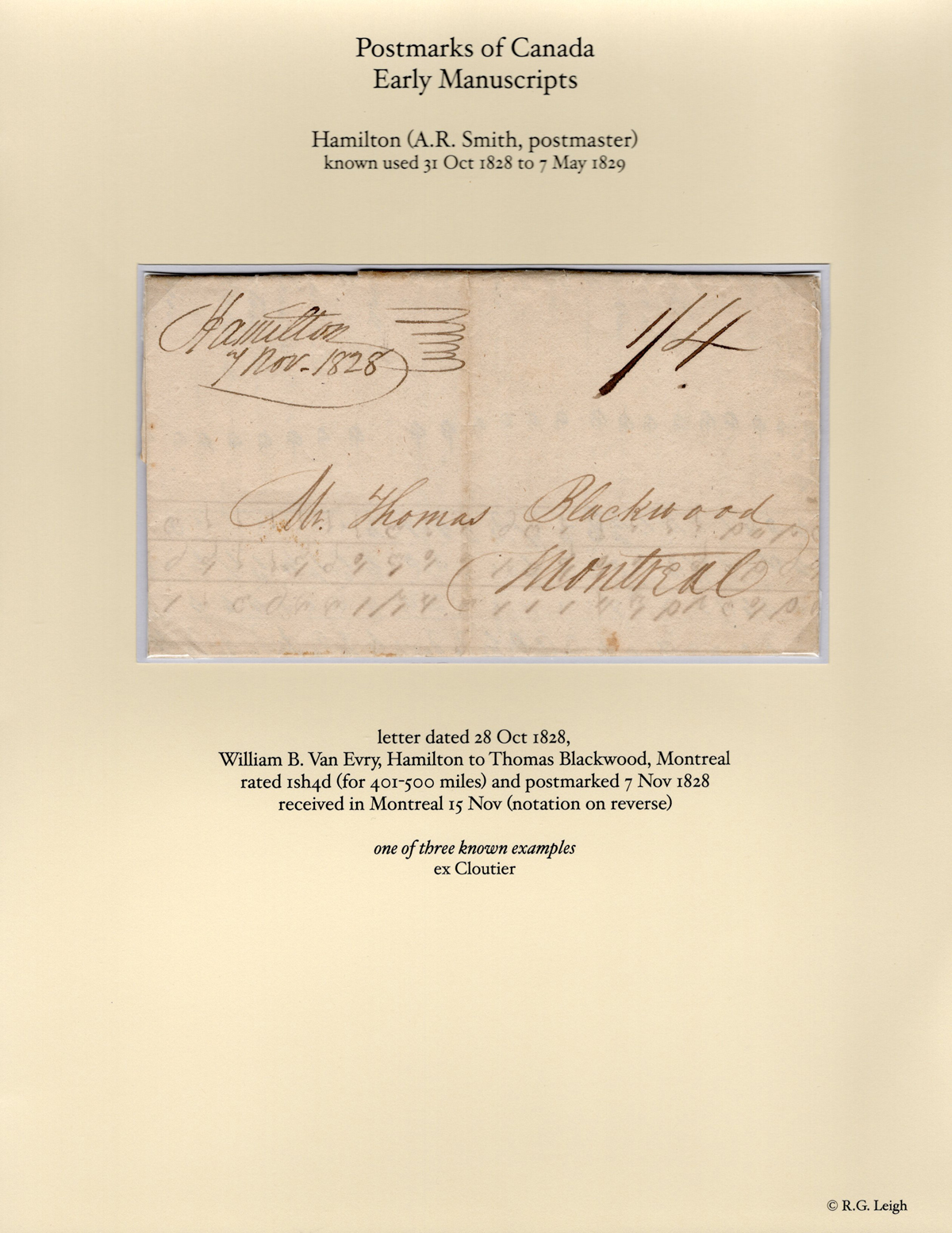 (U.C.) Manuscript Precursor Postmark on Folded Letter, applied to the folded letter by Postmaster A.R. Smith, addressed to Montréal, with a notation on back attesting it was received there on NOV.17, rated "1sh4d" manuscript. This rare postmark