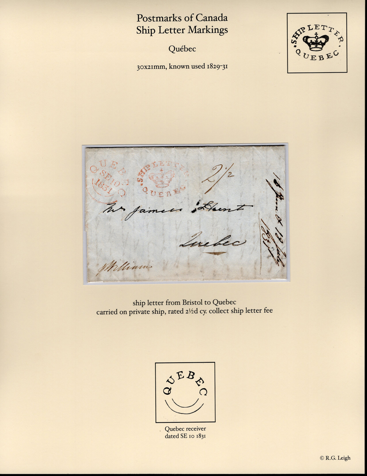 from Bristol to Québec City, mailed JUL.18.1831 (datelined inside, plus docketing on front) to Québec (SEP.10.1821 1829-type in red) alongside a fine small oval crowned Ship Letter / Quebec handstamp, also in red. The letter is endorsed "per