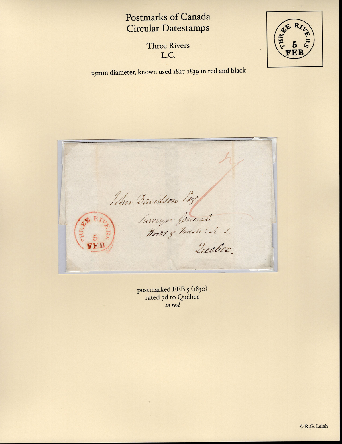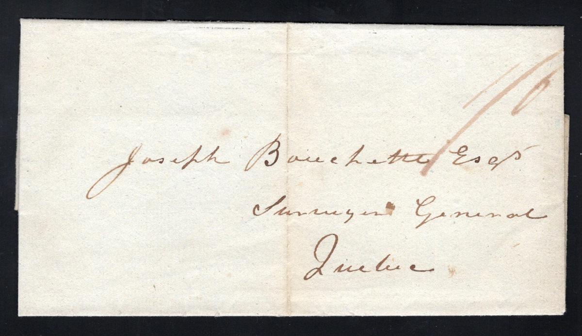 (L.C.) Folded Letter to Québec City, mailed FEB.3.1830 (small circle in red, with year confirmed in docketing on back), very fine.