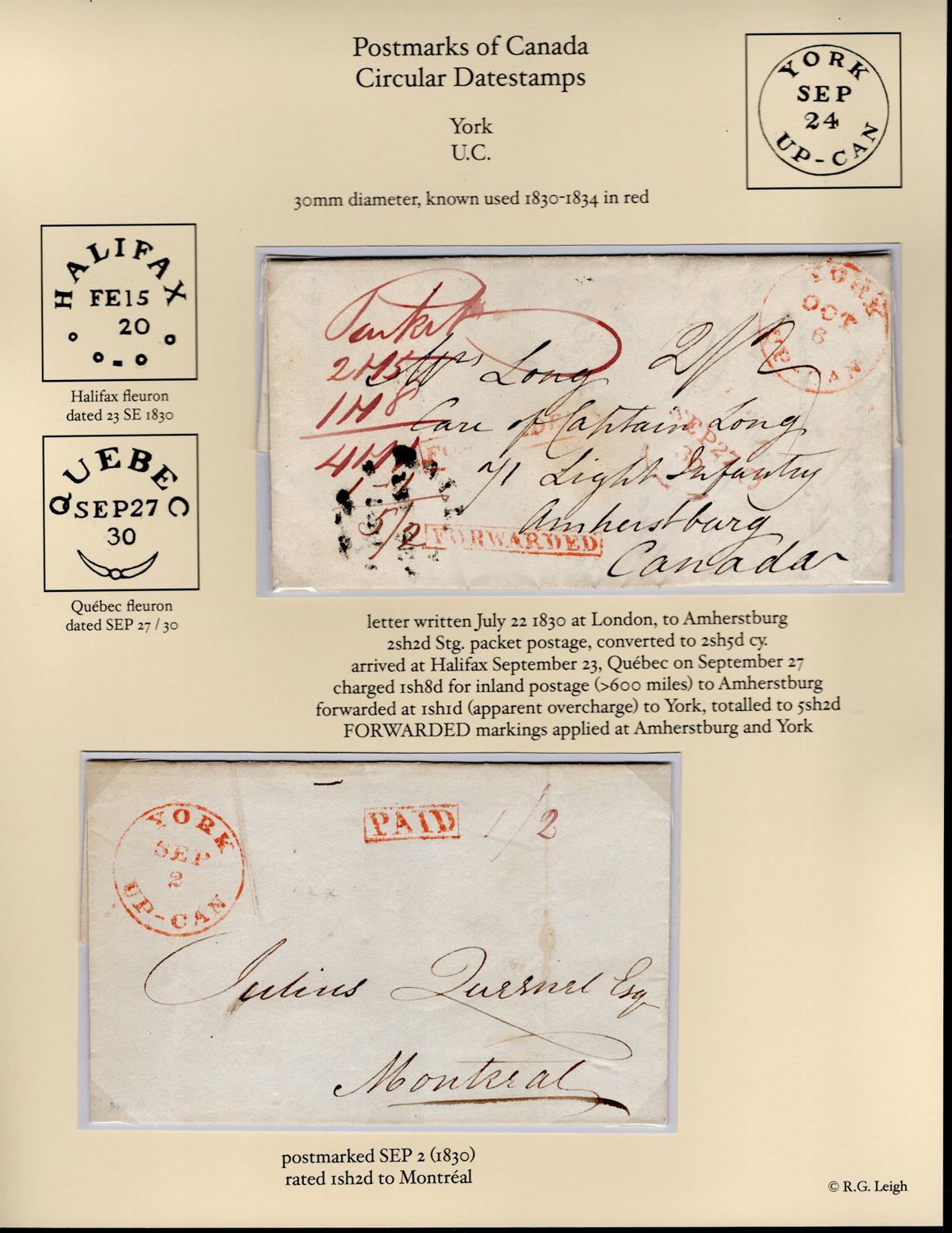 Circle Postmarks, first is a folded letter mailed from London, England on AUG.22.1830 (dateline inside and despatch c.d.s. on back) to Amherstburg, through Halifax (SEP.23 fleuron), Québec (SEP.27 fleuron), and York Up-Can (Oct.6 large circle),