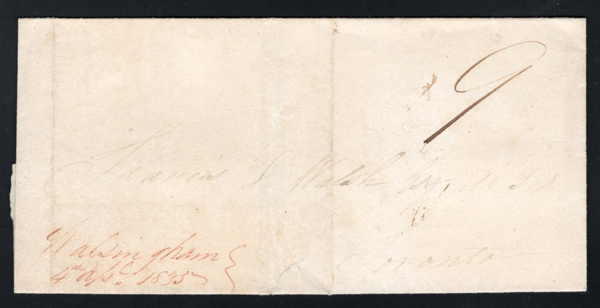 Manuscript Precursor on Folded Cover to Toronto, mailed on APR.1.1835 (two-line manuscript postmark in red), rated "9", a fine example of this postmark used for less than 3 years.