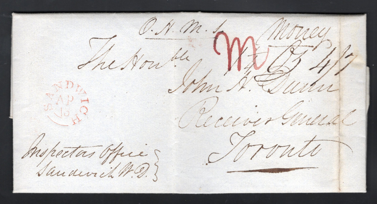 O.H.M.S. Folded Money Letter to Toronto, mailed on APR.15.1838 (1829-type in red with month and day typeset, year confirmed in letter inside and docketing), with "1¼ OZ 4/7" rate markings and in interesting manuscript "M" in red cursive. Long