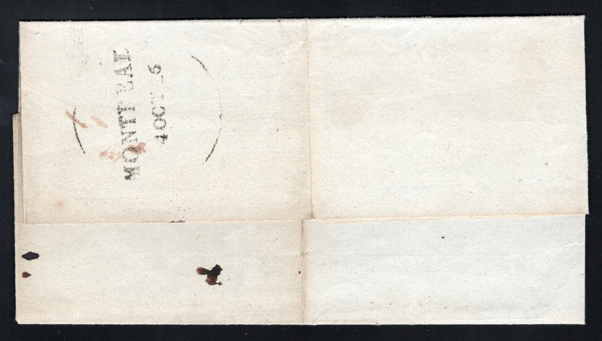 Straightline Cancel on Folded Cover addressed to Québec and rated 1/6 manuscript, the back shows a very fine strike of "MONTREAL / 4 OCT 26" (showing large parts of the postmarking instrument's outer ring). Very fine. (Scan 1)