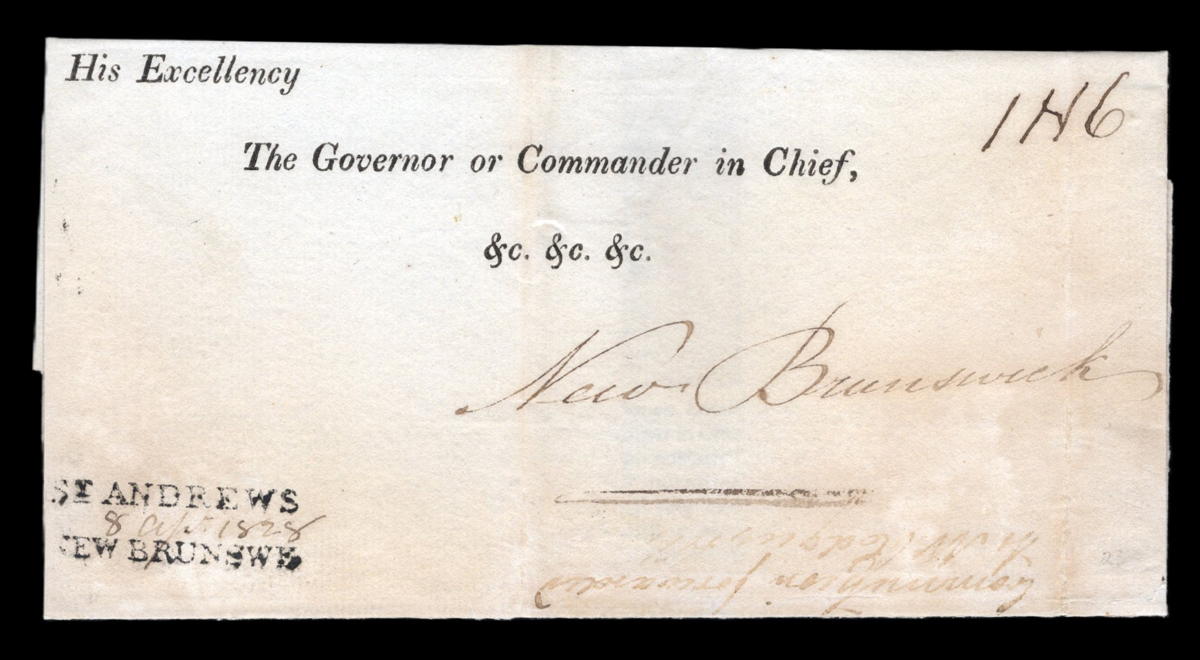 Straightline Cancel on Trans-Atlantic Folded Cover, a pre-printed cover apparently mailed from the Customs House in London, England, addressed to "His Excellency The Governor or Commander in Chief, New Brunswick" and rated "1N6" manuscript, with
