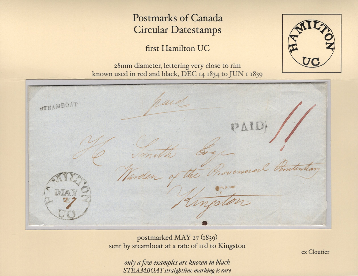 (U.C.) "Steamboat" Straightline on Folded Letter, mailed on MAY.27.1839 using the first type of Hamilton c.d.s. (with lettering very close to rim, this being one of only two recorded strikes in black as the rest are red). Interestingly, the only
