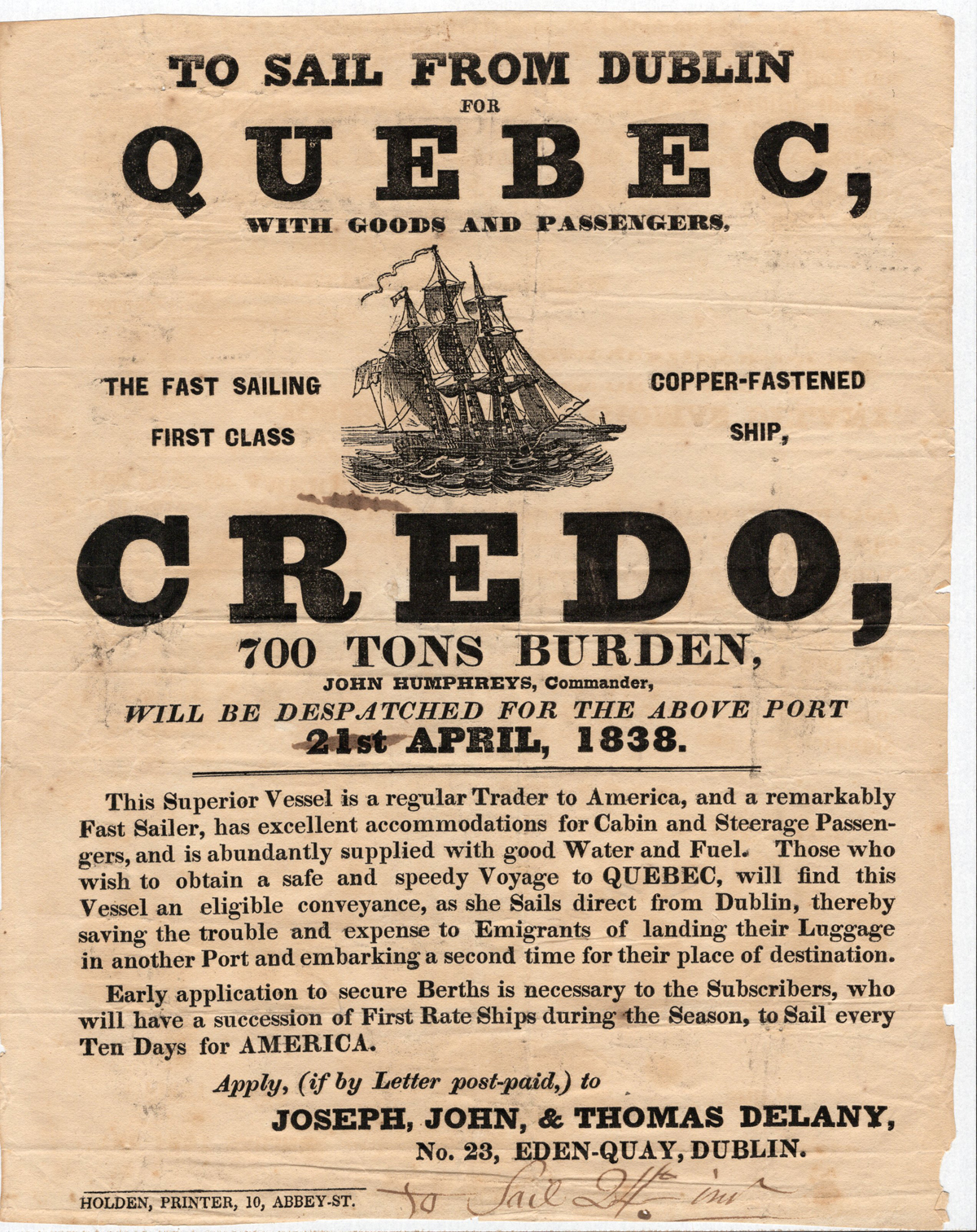 Broadsheet Announcing the Sailing of the Ship “Credo” from Dublin to Quebec City, originally printed to say it departed on April 21st, 1838, corrected by pen to the 24th. It describes that this is a fast ship that can accommodate passengers and
