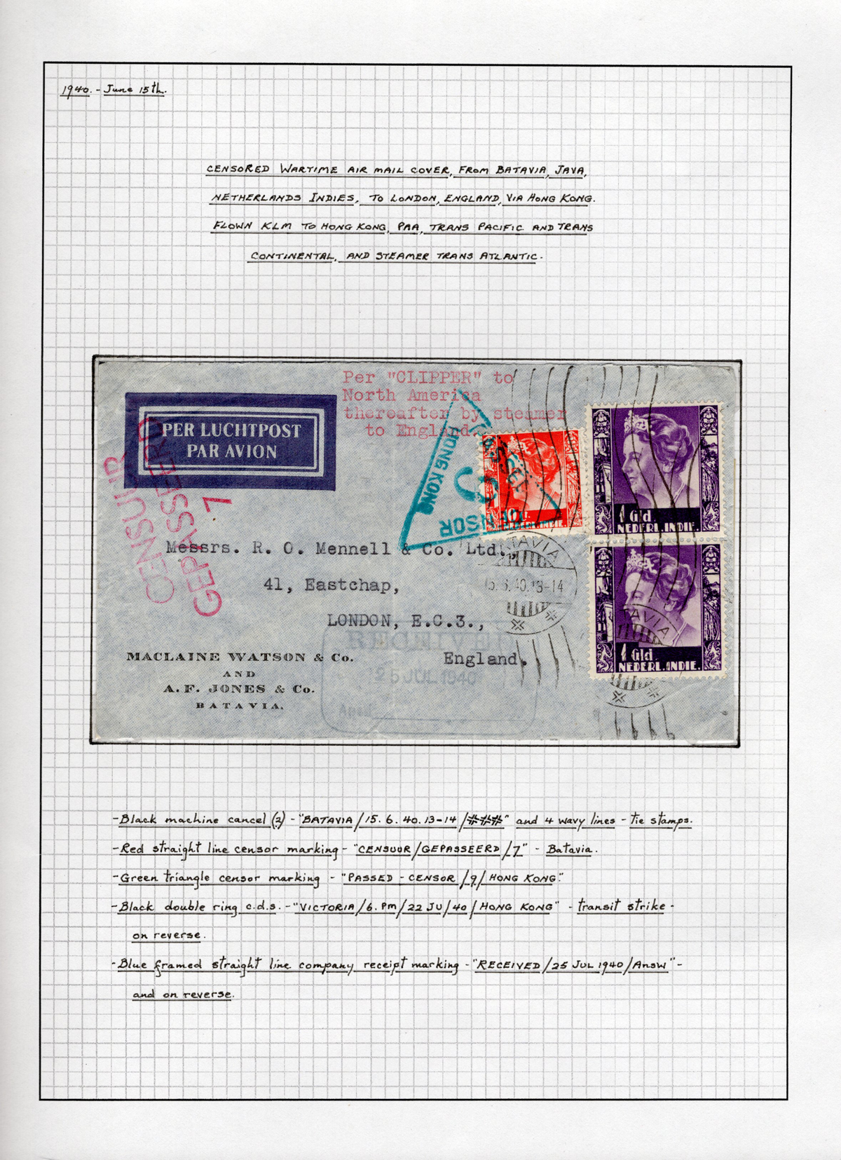 handstamp in green (type 3, recorded used between MAY.30.1940 and DEC.18.1940) and a "CENSUUR / GEPASSEERD / 7" handstamp in red (applied in Batavia), and an endorsement reading "Per clipper to North America thereafter by steamer to England" plus a