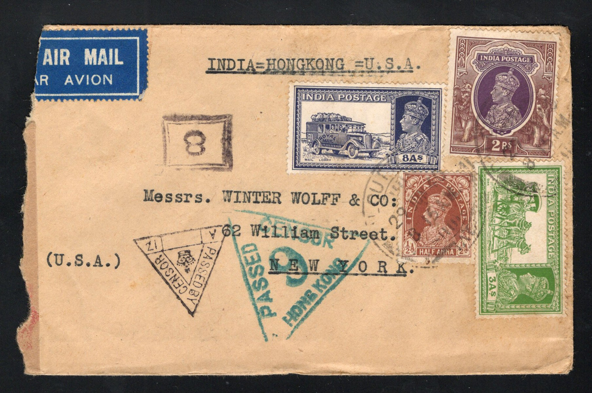 Airmail Cover to New York City, franked with 4 India stamps (2r, 8a, 3a and ½a), all tied to cover by Calcutta JUN.29.1940 c.d.s., endorsed "India = Hong Kong = U.S.A.". The cover also shows a "Passed / Censor / Hong Kong / 9" triangular