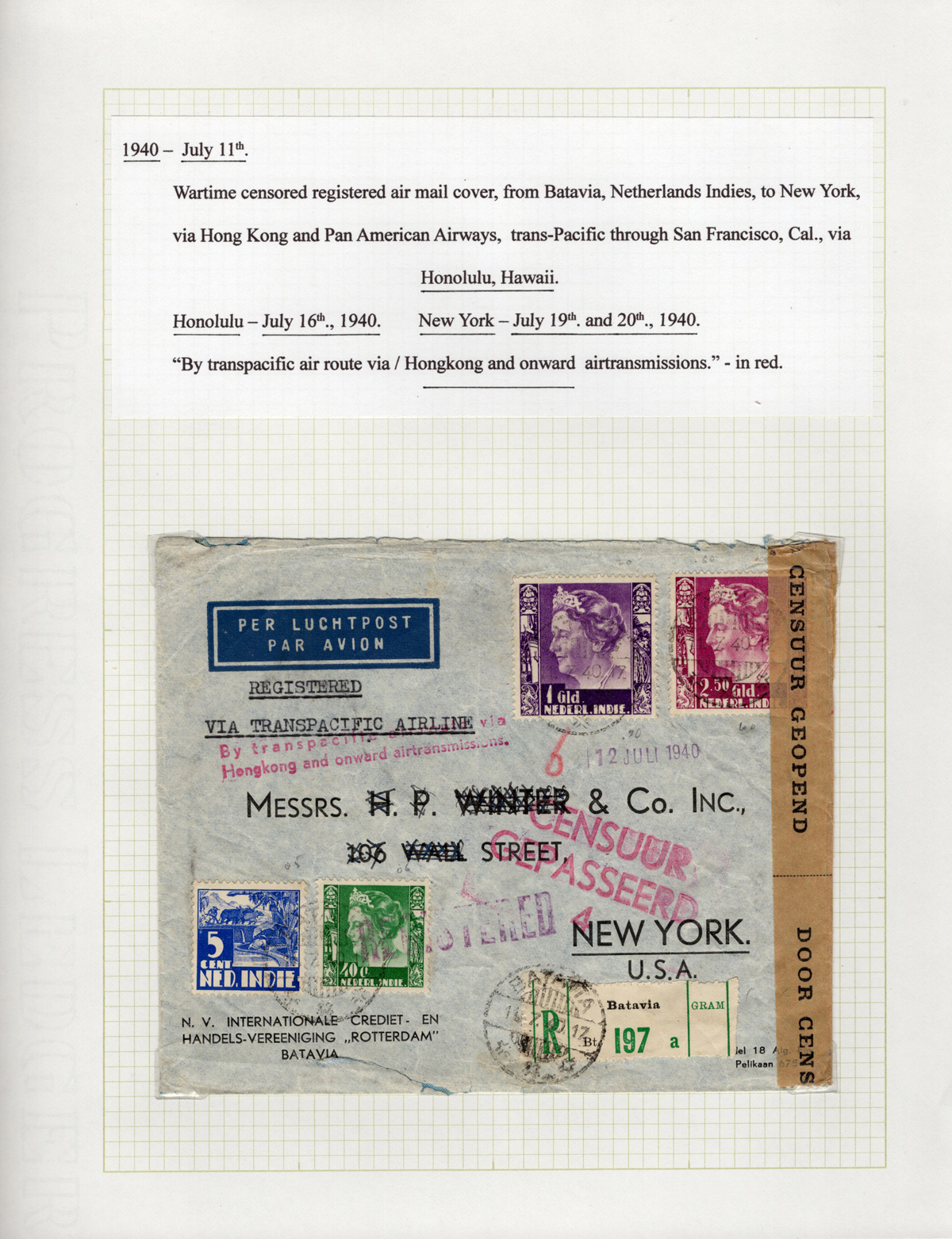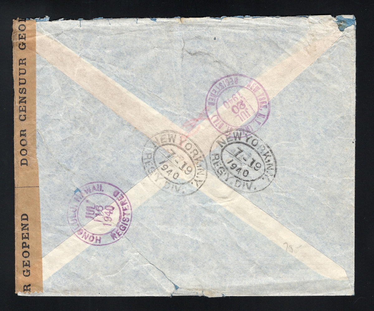 Netherlands Indies Airmail Registered Cover to New York City, franked with 4 stamps totaling 3g95c, all tied to cover by Batavia JUL.11.1940 c.d.s. The cover also shows a "CENSUUR / GEPASSEERD / 4" handstamp applied at Batavia, as well as a "DOOR