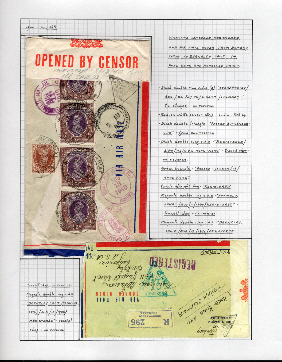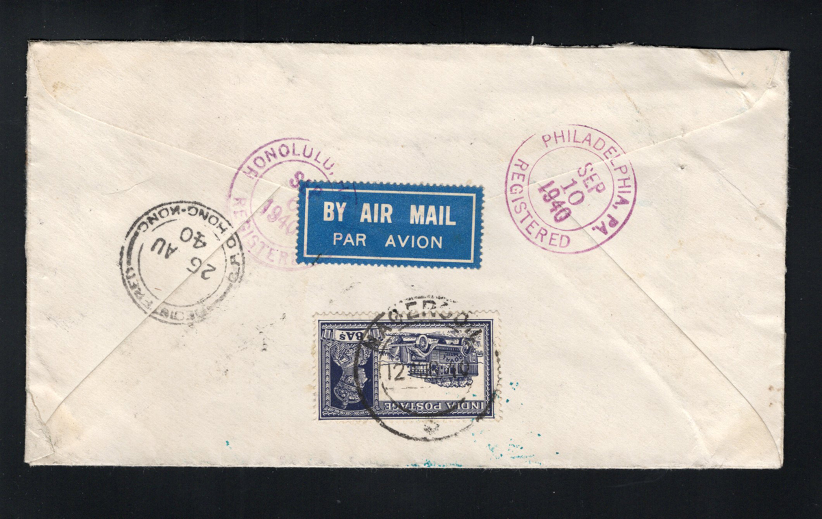 Airmail Registered Cover to Berkley California, franked on back with 5 India stamps totaling 8r½a, all tied to cover by Secretariat / Bombay JUL.26.1940 c.d.s., with "Via Hong Kong and Pacific Clipper" endorsement. The cover also shows a "Passed