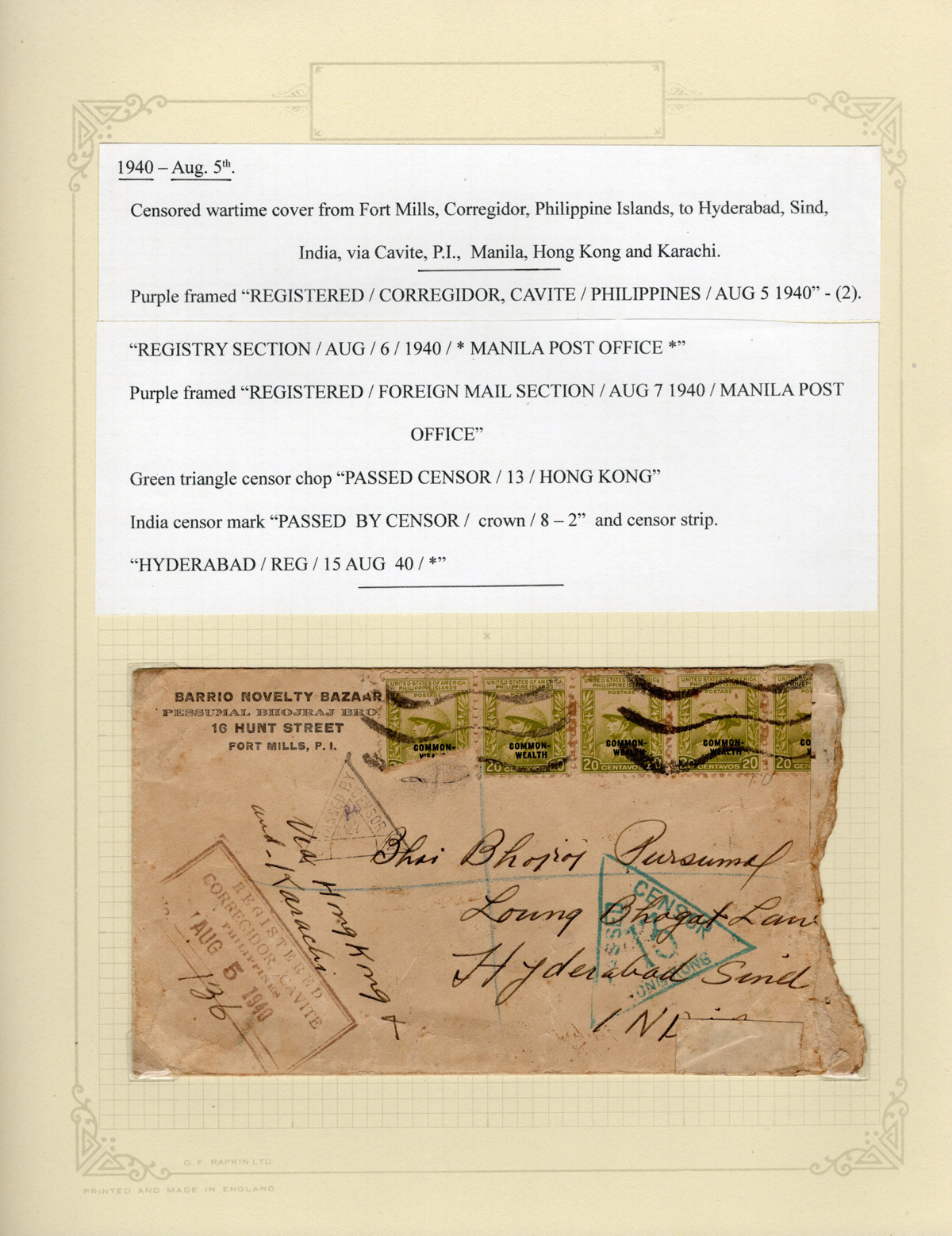 Philippines Cover to India, franked with a (faulty) strip of 5 Philippines 20c stamps (plus two 2c stamps on back), all tied to cover by wavy line obliterators, with a boxed AUG.5.1940 registration handstamp, endorsed "via Hong Kong and Karachi".