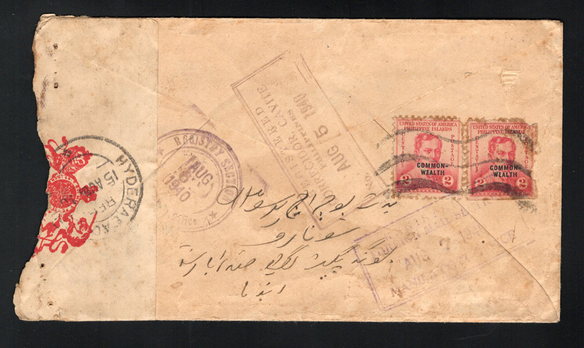 a Manilla AUG.7 transit and a Hyderabad AUG.15 receiver. Roughly opened at right, else fine. (Scan 1)