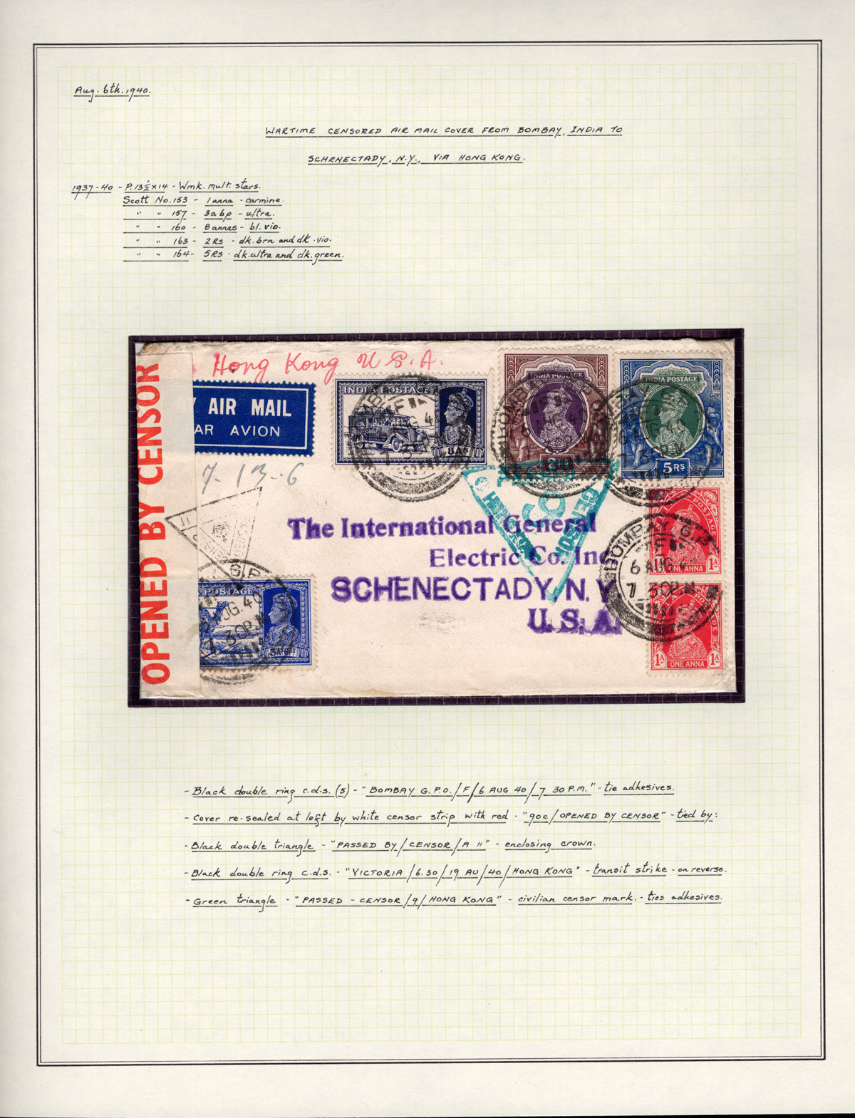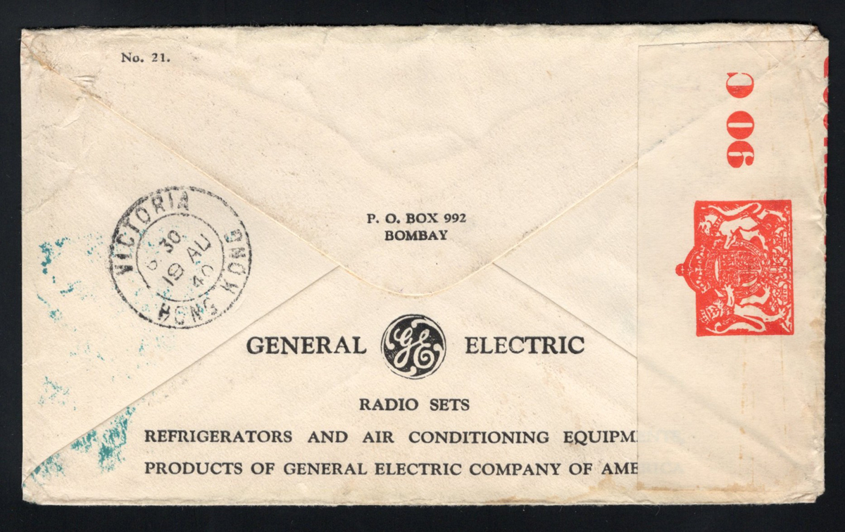 Airmail Cover to the United States, a General Electric Radio Sets advertising cover franked with 6 India stamps (5r, 2r, 8a, 3a and pair of 1a), all tied to cover by Bombay G.P.O. AUG.6.1940 c.d.s. The cover also shows a "Passed / Censor / Hong