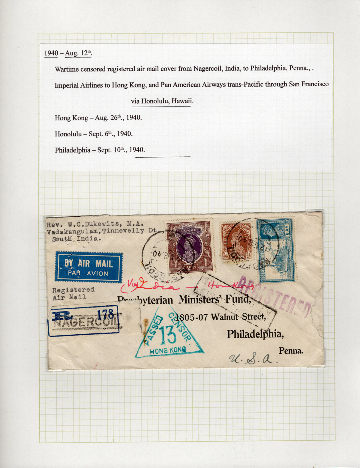 Airmail Registered Cover to the United States, franked with 4 India stamps (2r, two 6a and ½a), all tied to cover by Nagercoil AUG.12.1940 c.d.s. The cover also shows a "Passed / Censor / Hong Kong / 13" triangular handstamp in green (type 3,