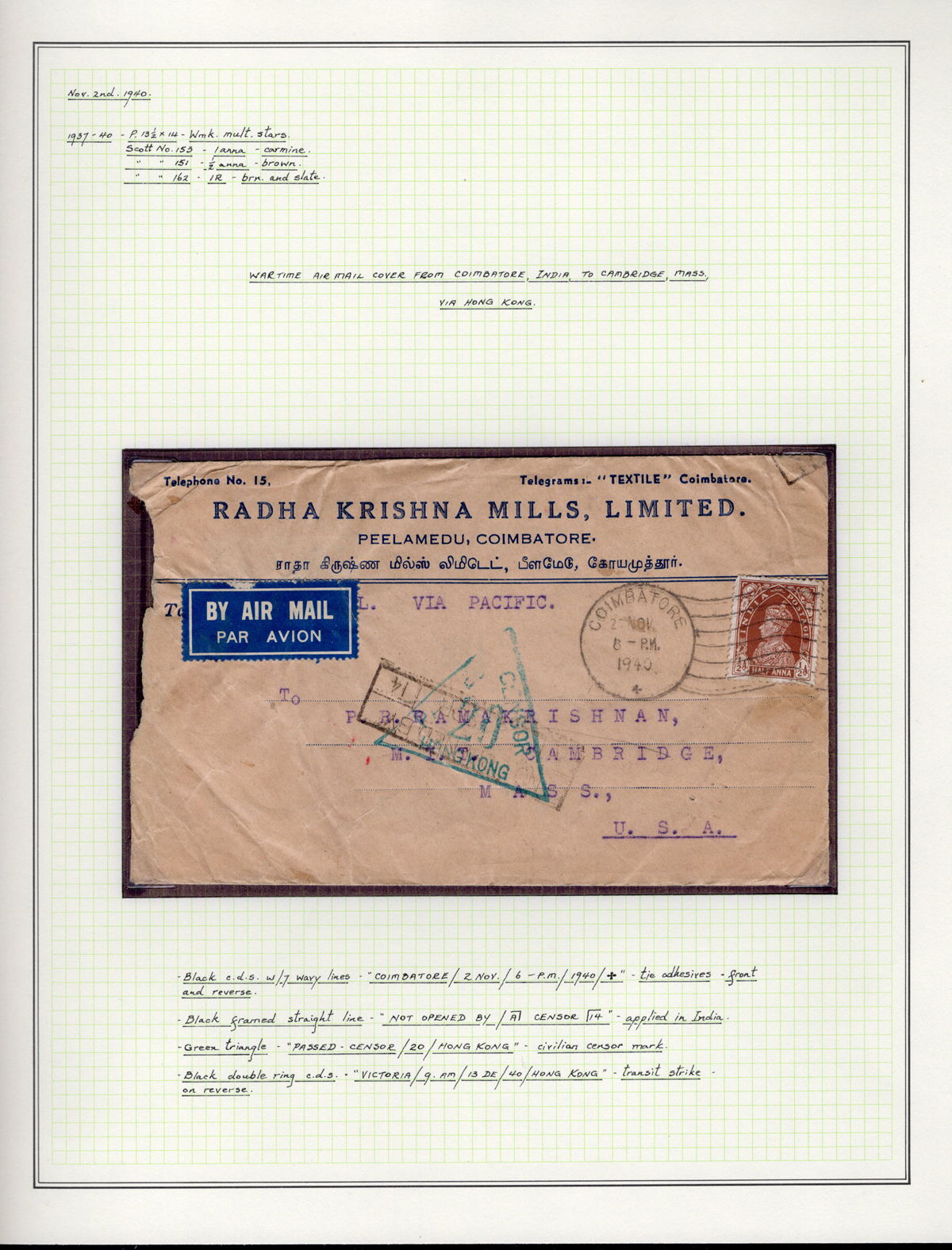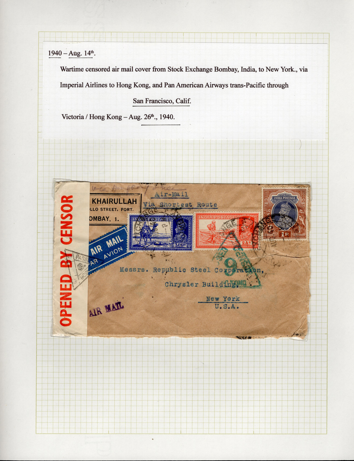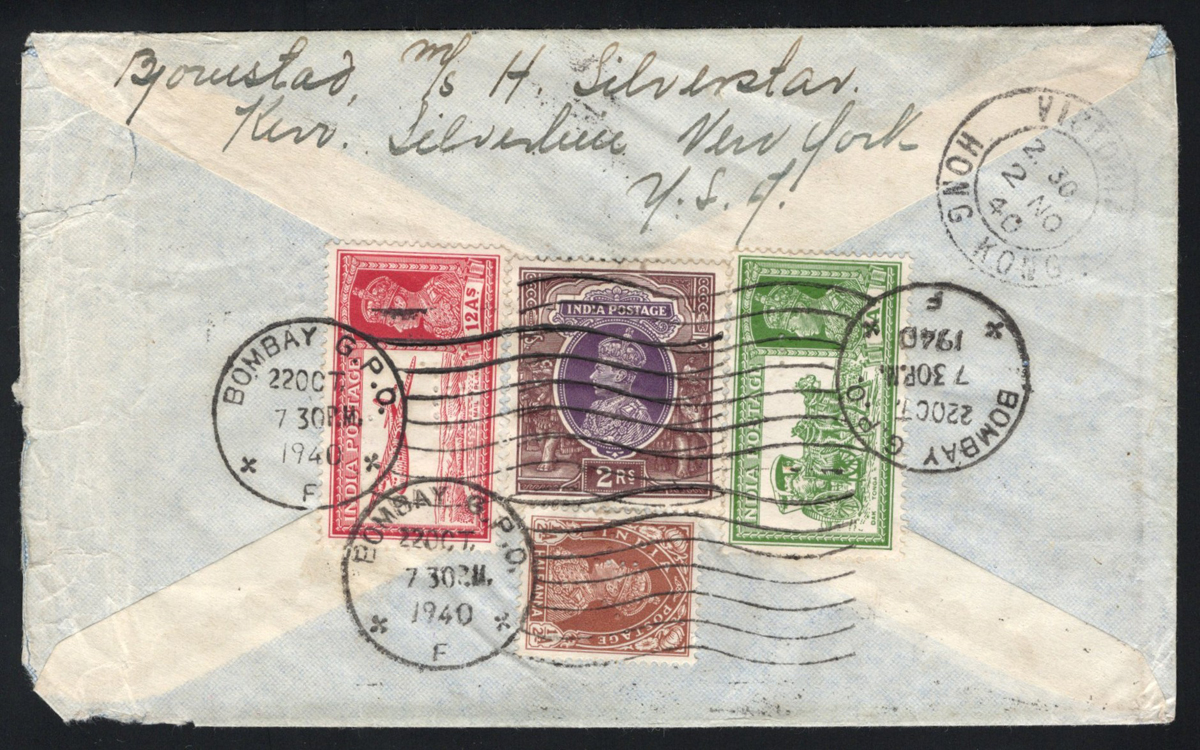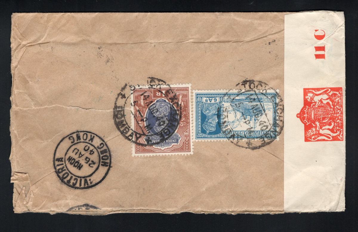 Airmail Cover to the United States, franked with 5 India stamps (two 1r, 6a, 3a6p and 2a), all tied to cover by Stock Exchange / Bombay AUG.14.1940 c.d.s., endorsed "via Shortest Route". The cover also shows a "Passed / Censor / Hong Kong / 9"
