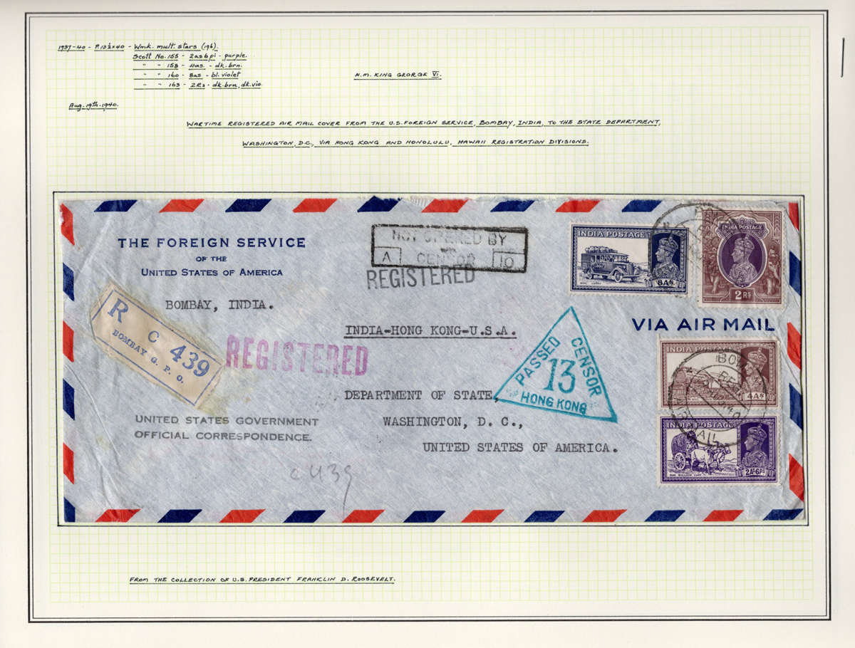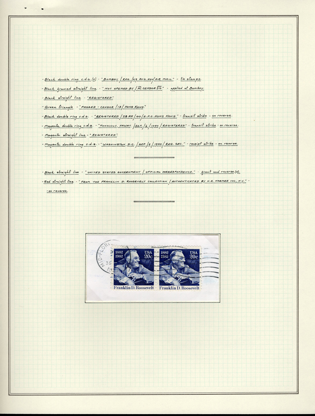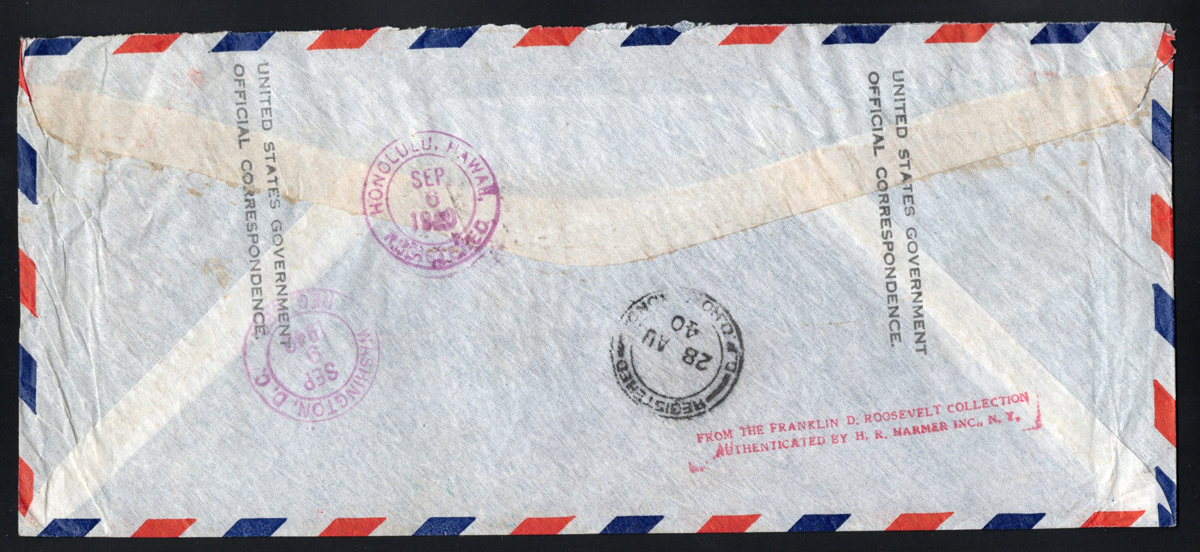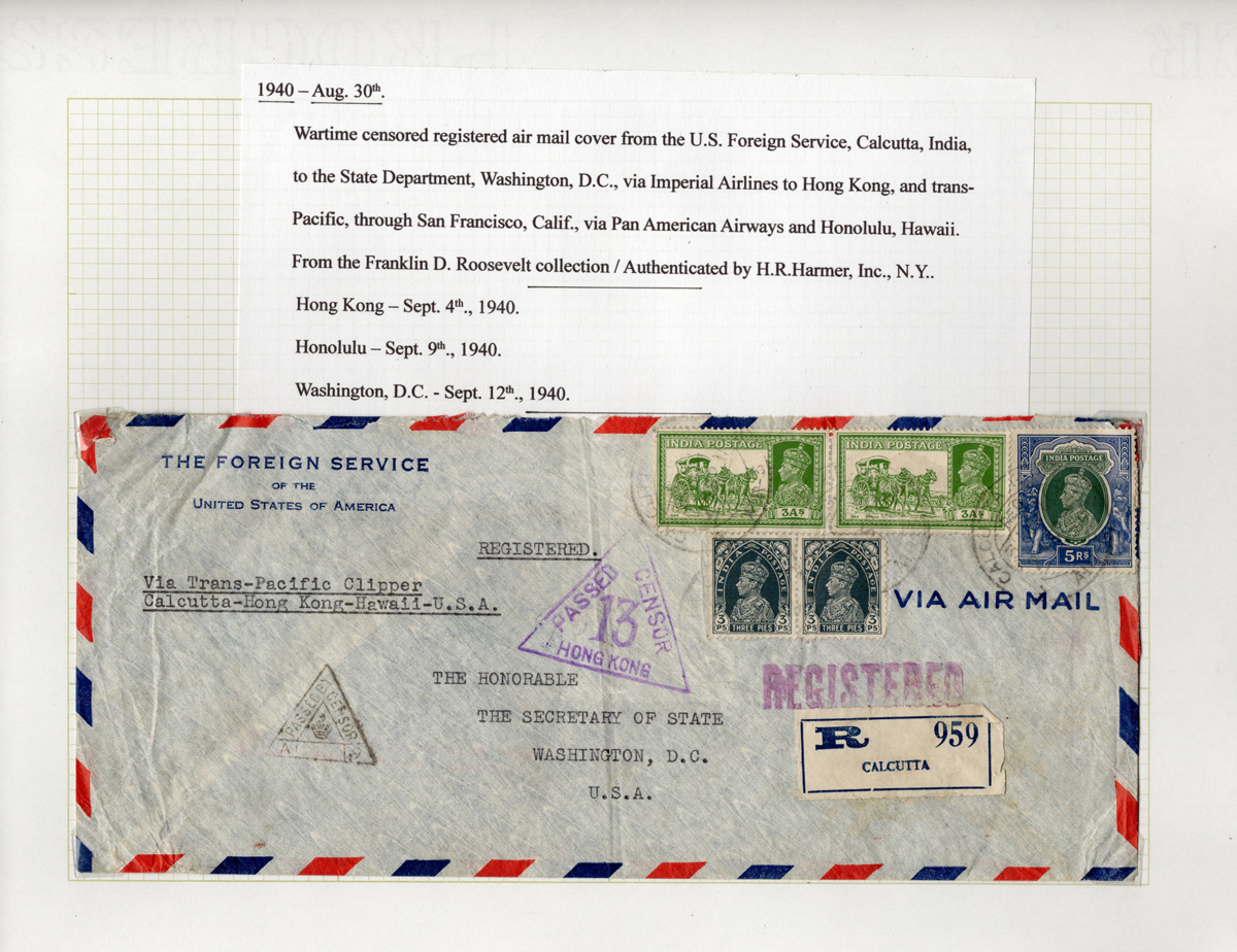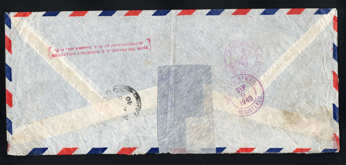 shows a Registered / G.P.O. Kong Kong SEP.4.1940 double circle transit, Honolulu Hawaii SEP.9 double circle transit and Washington D.C. SEP.12.1940 double circle receiver. Piece cut-out from back, else very fine and ex Franklin D. Roosevelt