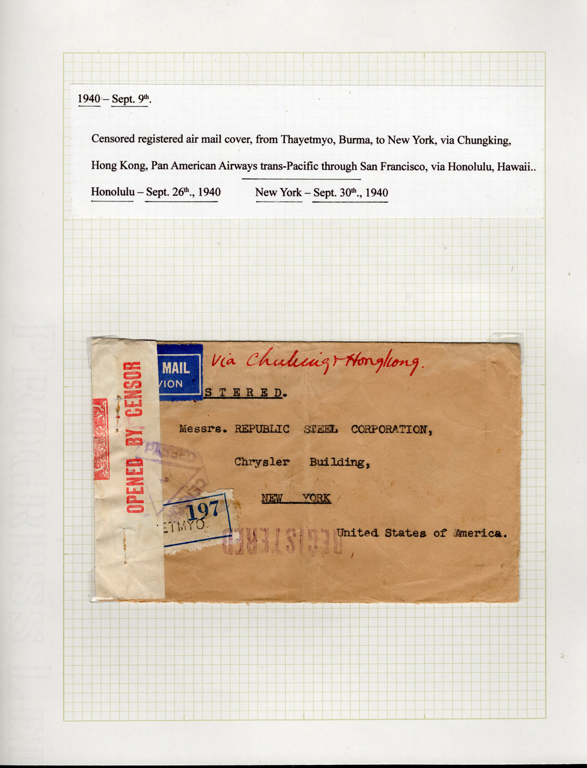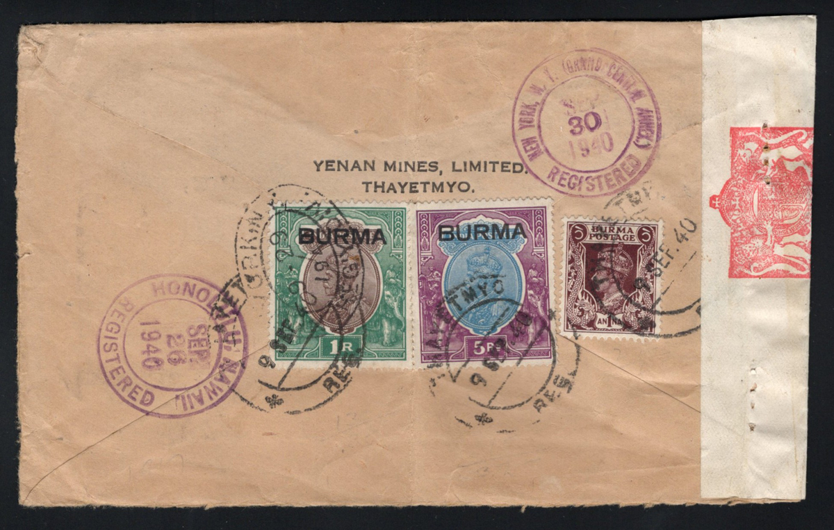 Airmail Registered Cover to the United States, franked with 3 Burma stamps (5r, 1r, 1a), all tied to cover by Thayetmyo SEP.9.1940 c.d.s., endorsed "via Chungking and Hong Kong" The cover also has a OPENED BY CENSOR" Indian re-sealing tape, tied