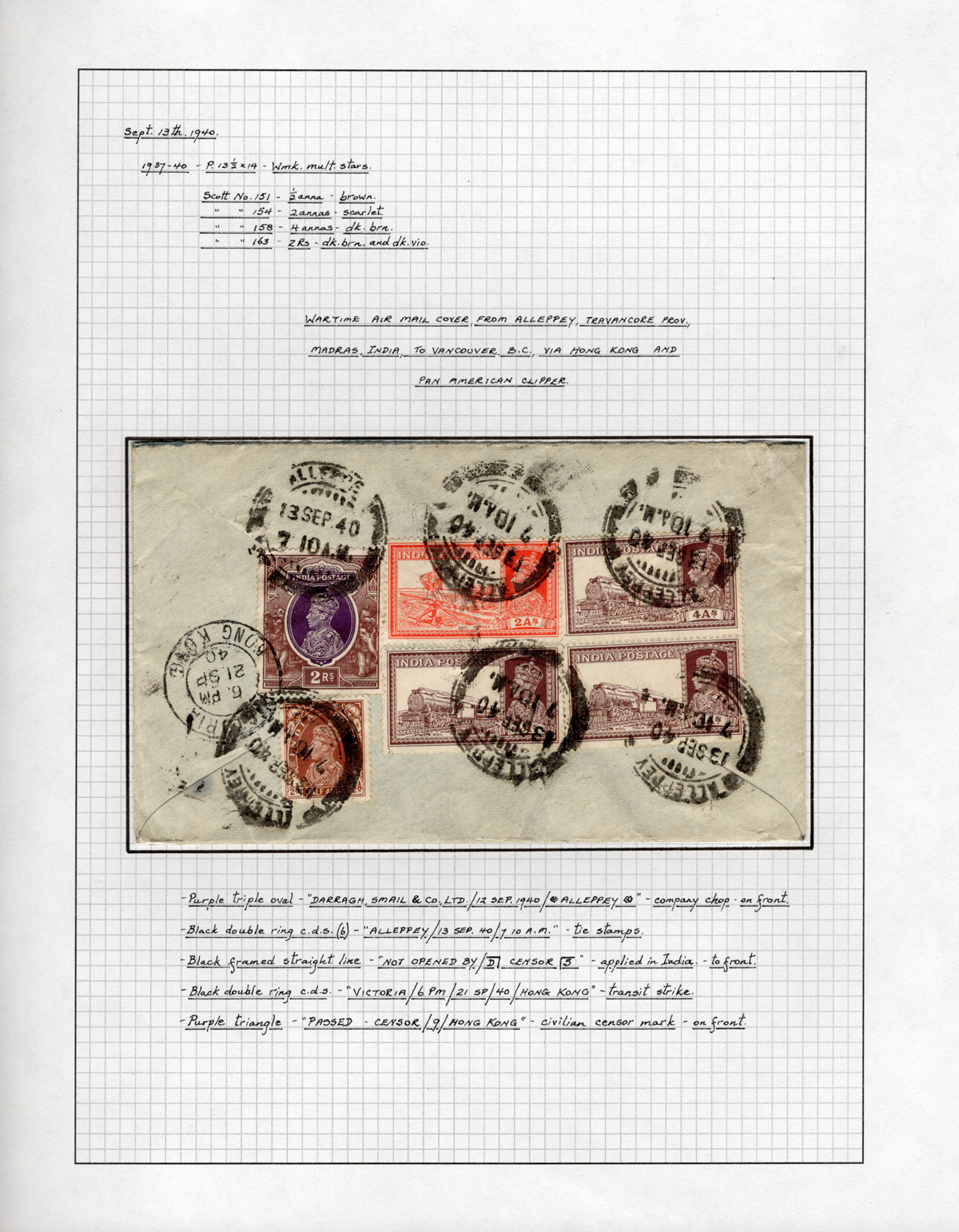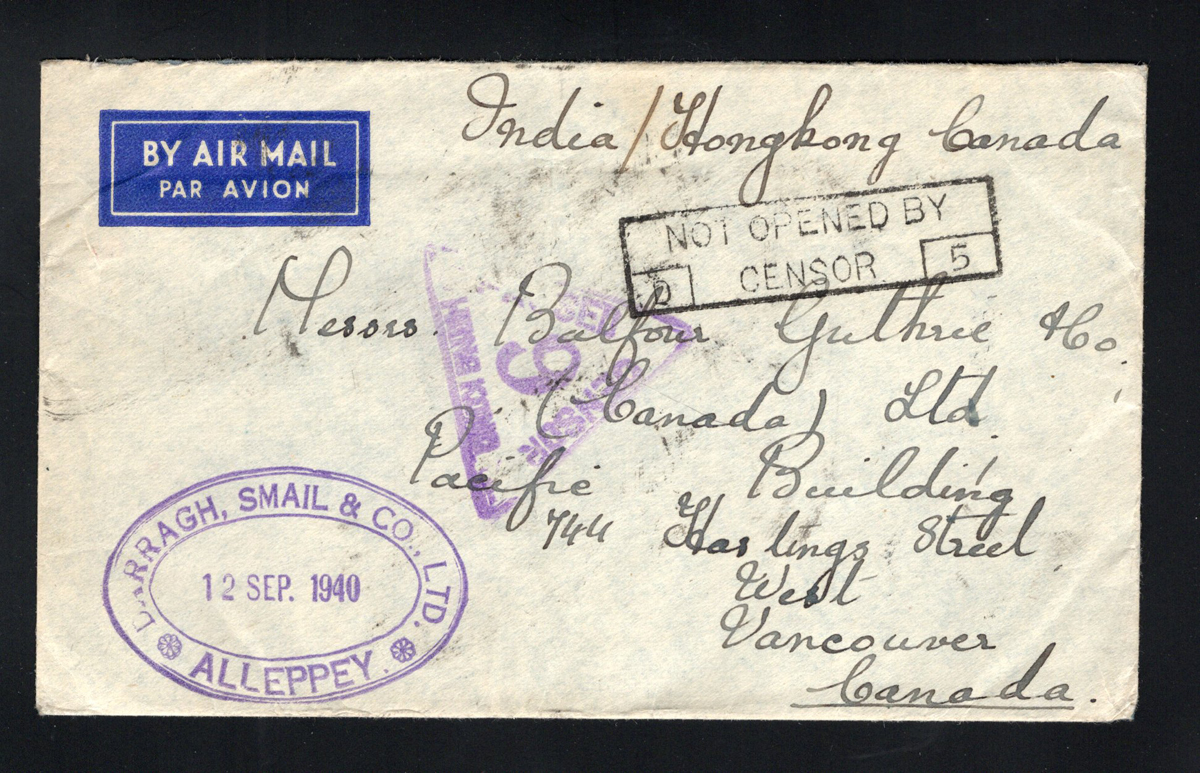 Airmail Cover to Vancouver Canada, a "Darragh, Smail & Co. Ltd. Alleppey" business cover franked with 6 India stamps (2r, three 4a, 4a and ½a), all tied to cover by Alleppey SEP.13.1940 c.d.s., endorsed "India / Hong Kong - Canada". The cover
