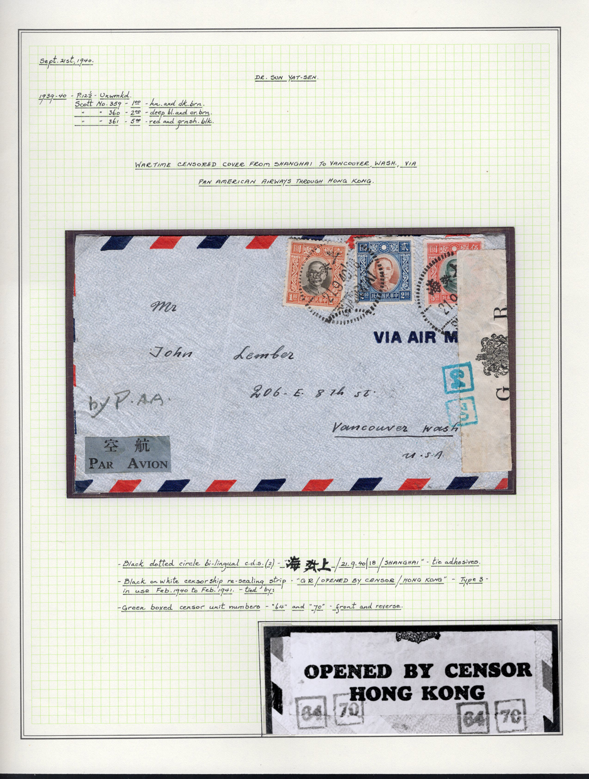 Airmail Cover to the United States, franked with 3 different Dr. Sun Yat-sen stamps totaling $8, all tied to cover by two Shanghai SEP.21.1940 bilingual dotted c.d.s. The cover also shows a "G R / Passed by Censor / Hong Kong / 13" re-sealing
