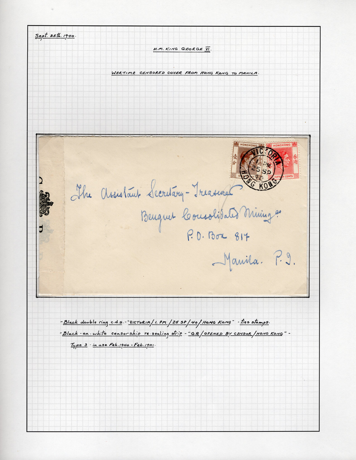 Kong Cover to Philippine Islands, franked with 2 Hong Kong stamps totaling 16c, both tied to cover by a Victoria / Hong Kong SEP.25.1940 double circle. The cover also has a "G.R. / OPENED BY CENSOR / HONG KONG" re-sealing tape. Very fine. (Scan 1)