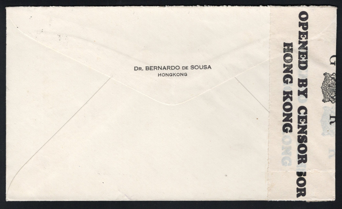 / Censor / Hong Kong / 13" triangular handstamp in green (type 3, recorded used between MAY.30.1940 and DEC.18.1940) and a "OPENED BY CENSOR" Indian re-sealing tape plus a small triangular Indian censor handstamp in black. Back shows a Registered /