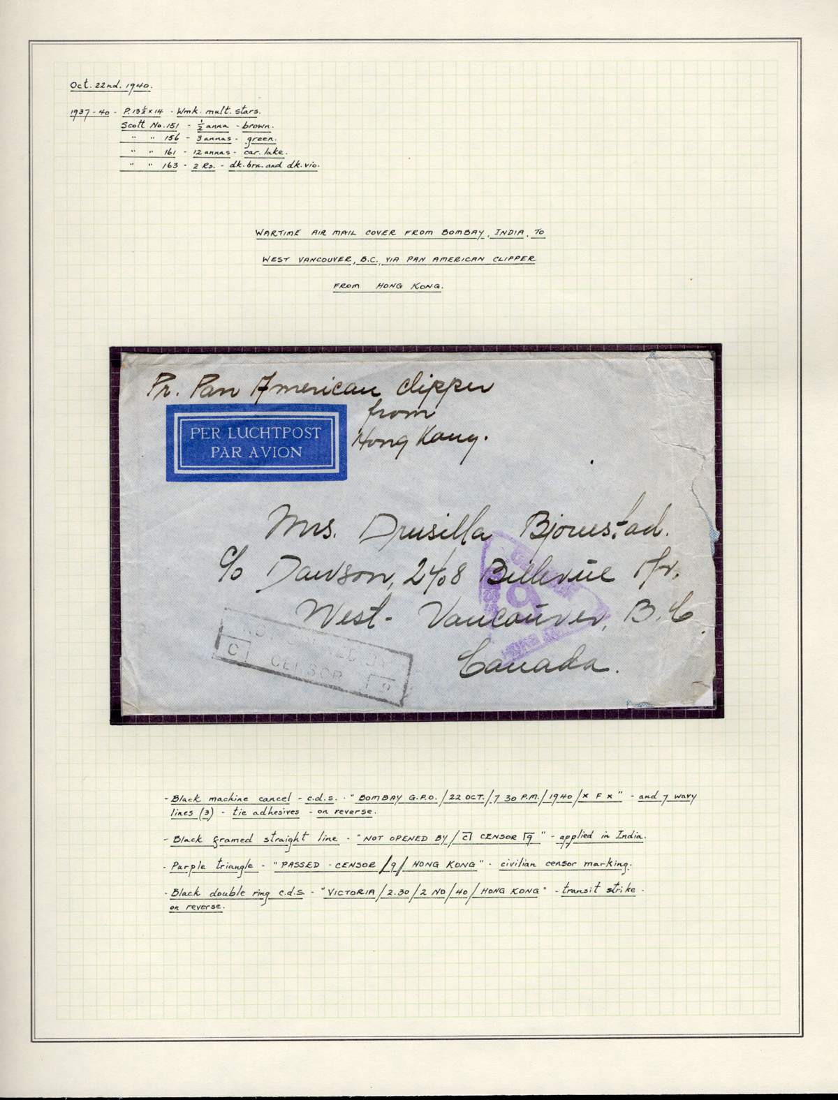 Airmail Cover to West Vancouver Canada, franked with 4 India stamps on back (2r, 12a, 3a and ½a), all tied to cover by Bombay G.P.O. OCT.22.1940 c.d.s., endorsed "Pr. Pan American Clipper from Hong Kong". The cover also shows a "Passed / Censor /