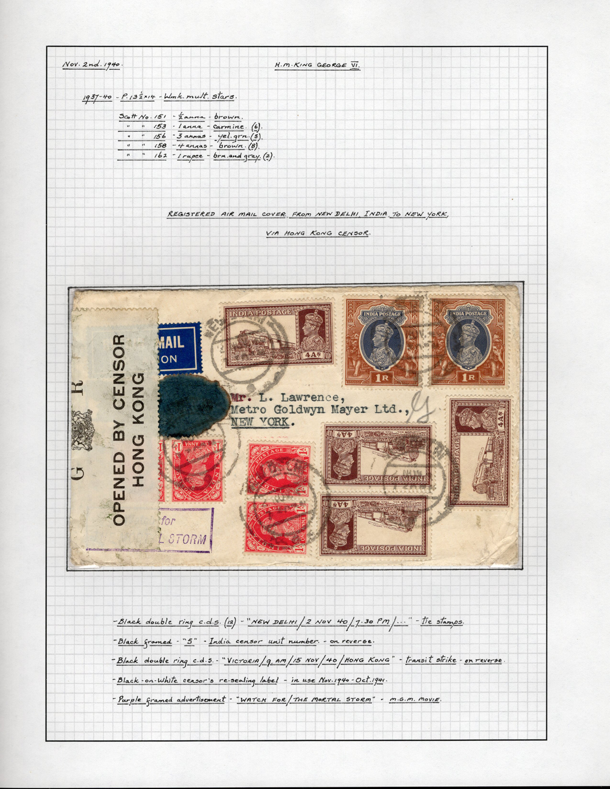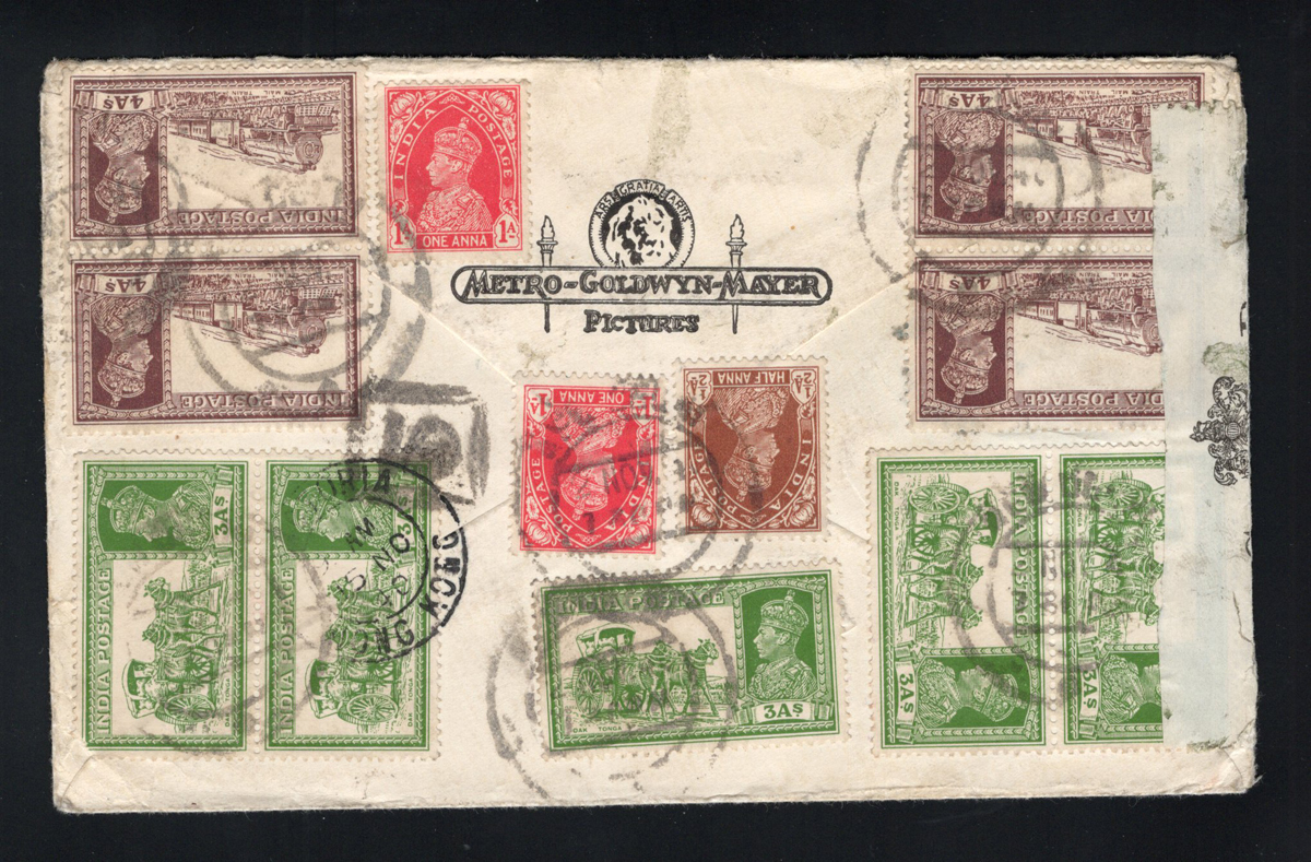 Airmail Registered Cover to New York City, a Metro-Goldwyn-Mayer Pictures cover franked with 22 India stamps on front and back (two 1r, eight 4a, five 3a, six 1a and one ½a), all tied to cover by New Delhi NOV.2.1940 c.d.s. The cover also has a