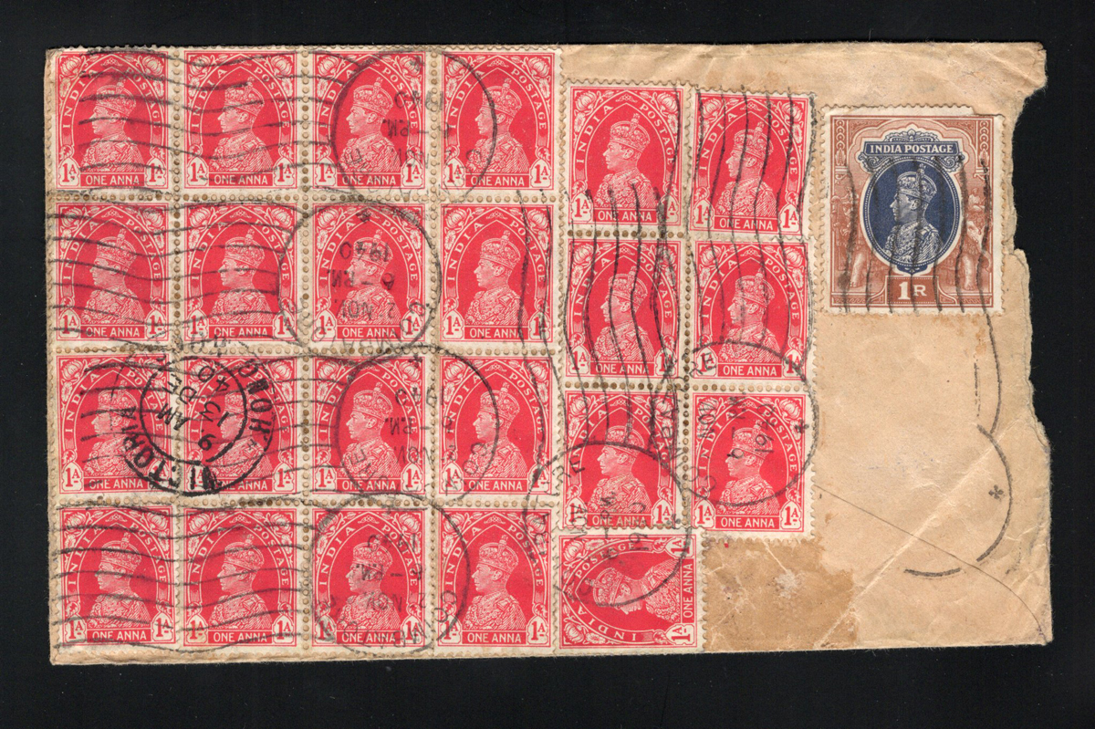 Airmail Cover to the United States, a Radha Krishna Mills Ltd. cover franked with 25 India stamps (one is missing) on front and back (1r, twenty three 1a and one ½a), all tied to cover by Coimbatore NOV.2.1940 machine cancels, endorsed "Via
