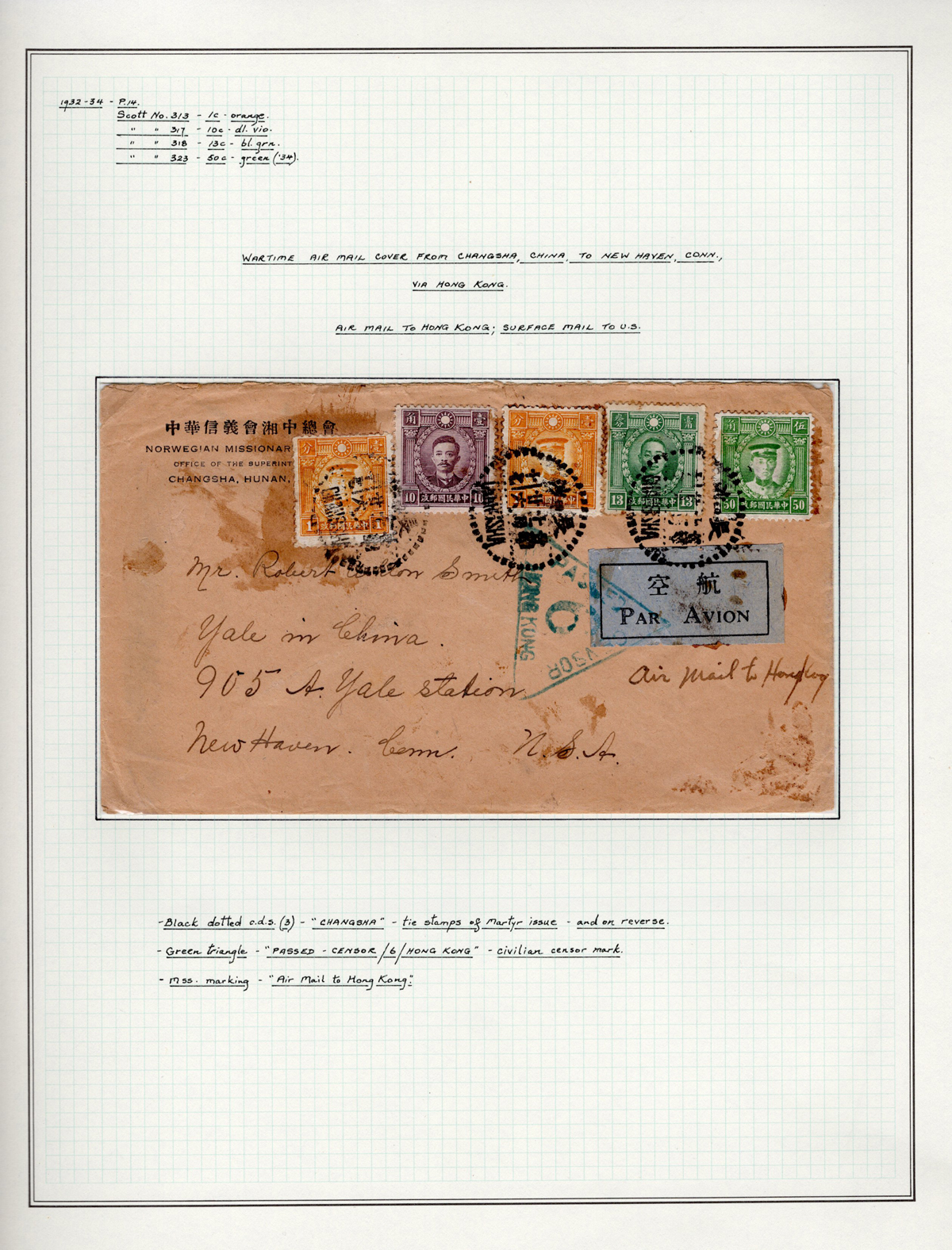 Airmail Cover to the United States, a Norwegian Missionary cover franked with 5 China stamps totaling 75c, all tied to cover by Changsha dotted c.d.s., endorsed "Airmail to Hong Kong". The cover also shows a "Passed / Censor / Hong Kong / 6"