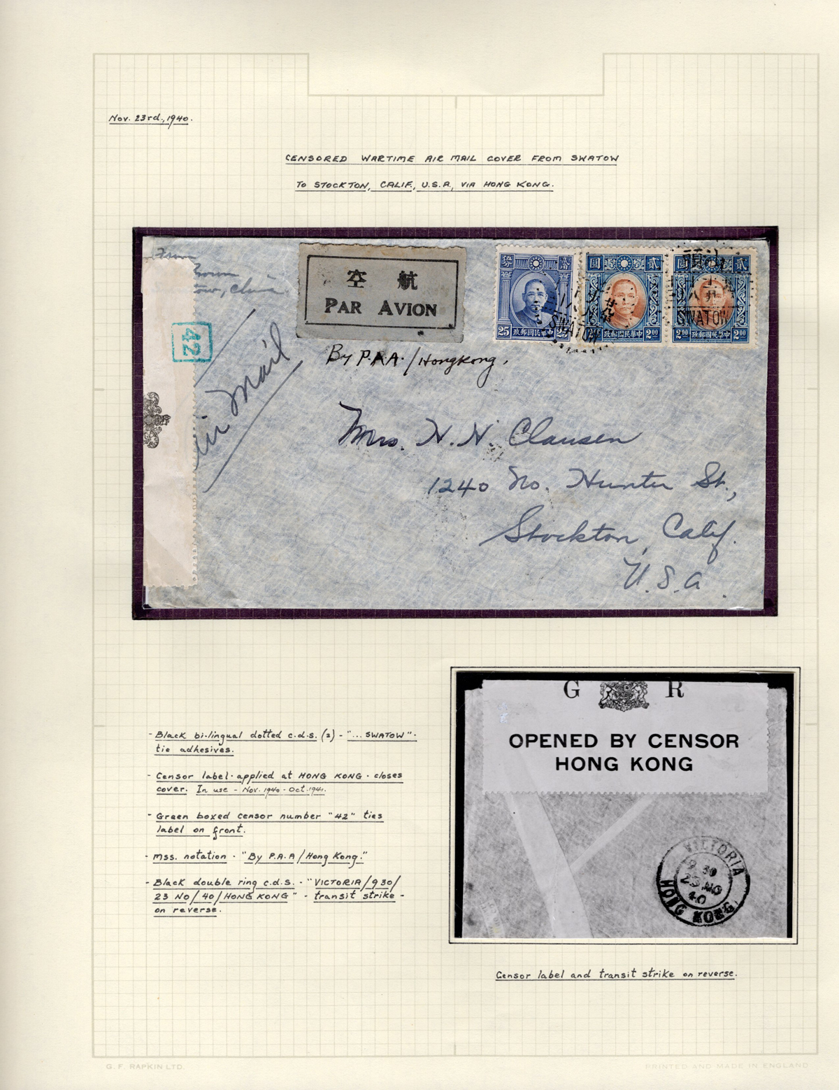 Airmail Cover to the United States, franked with 3 China stamps totaling $4.25, all tied to cover by Swatow bilingual dotted c.d.s., endorsed "By P.A.A. to Hong Kong". The cover also has a "G R / OPENED BY CENSOR / HONG KONG" re-sealing tape with
